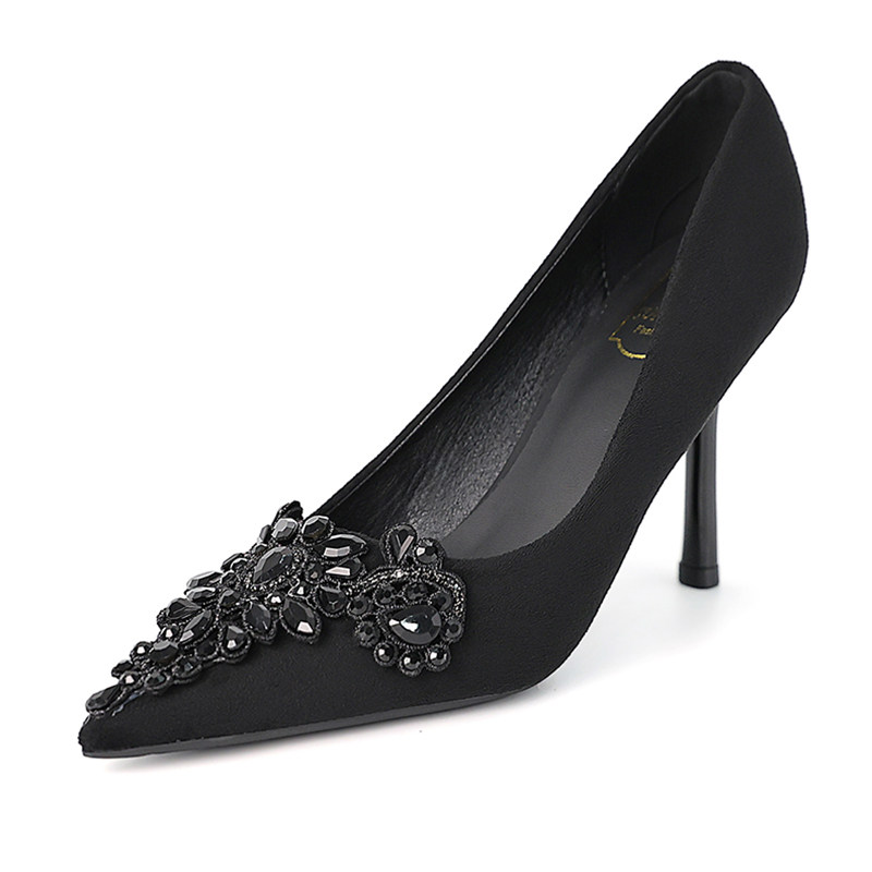 尖头细跟超高跟浅口单鞋黑色水钻