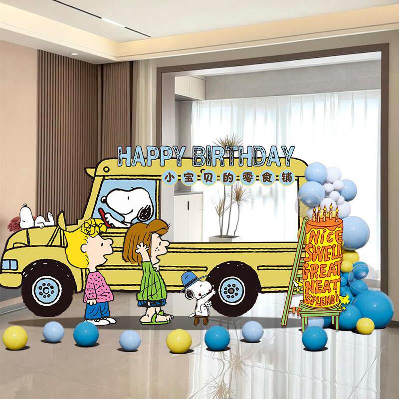 宝宝周岁生日布置场景装饰史努比主题儿童背景墙零食车kt板定制