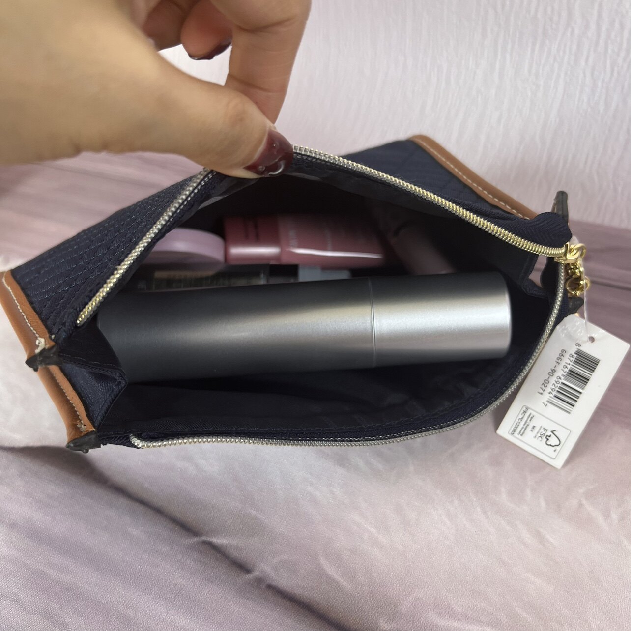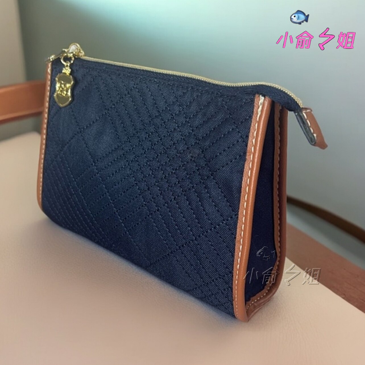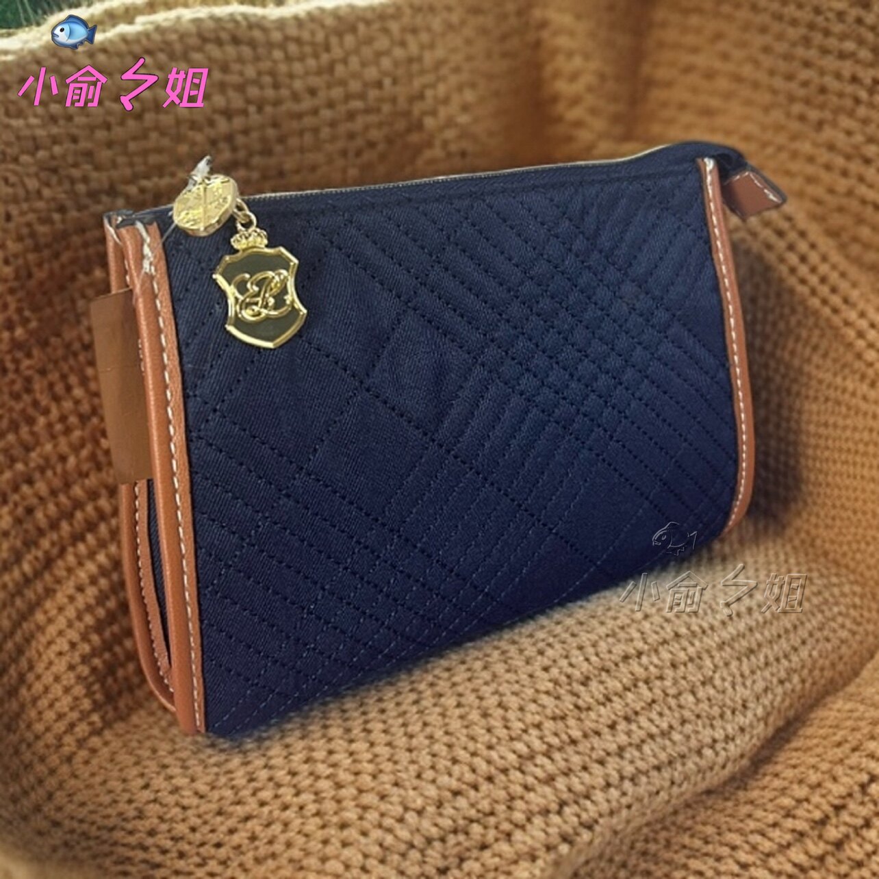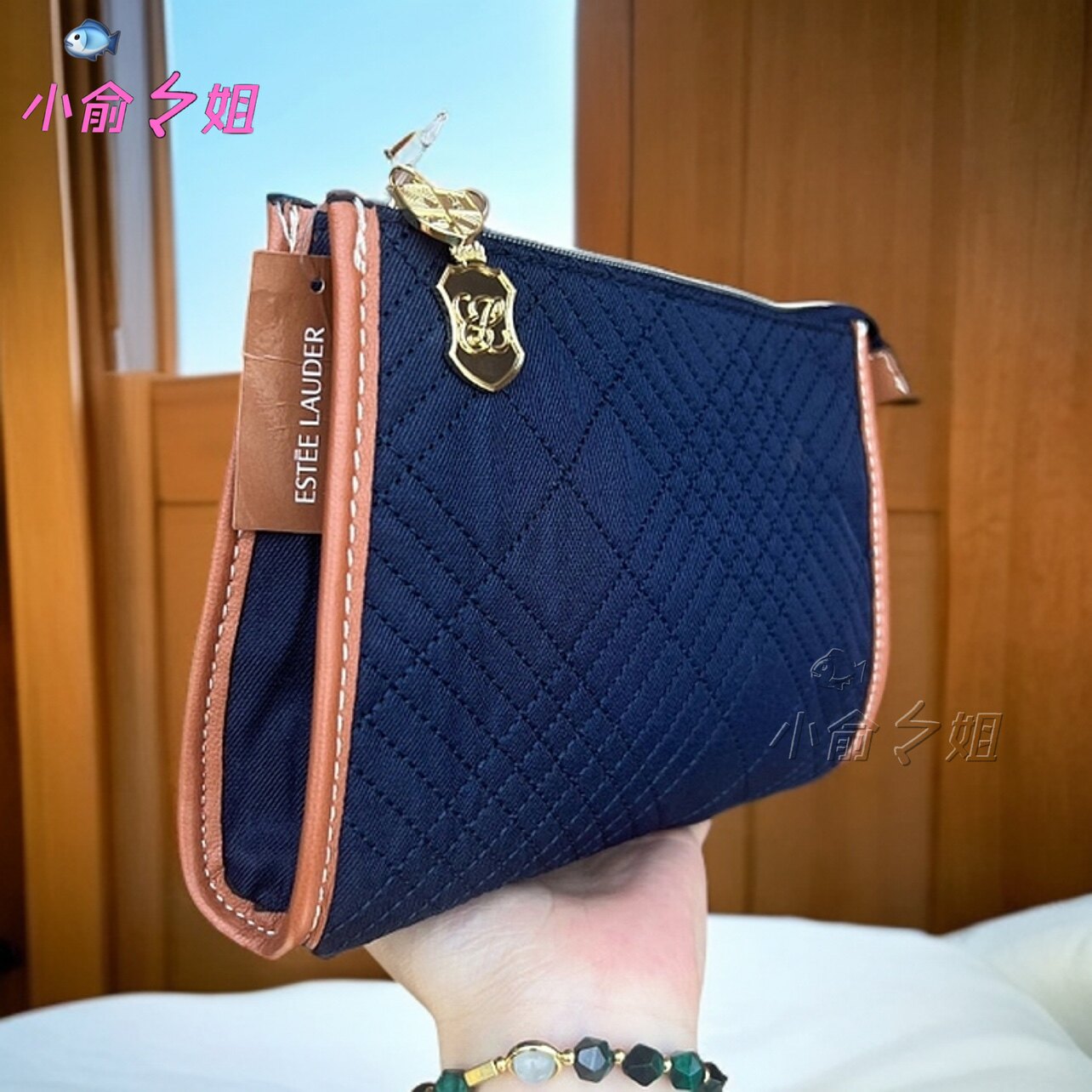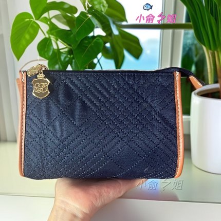 雅诗兰黛藏蓝色时尚简约布艺菱格走线化妆包收纳整理包