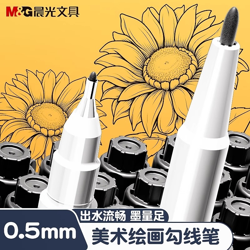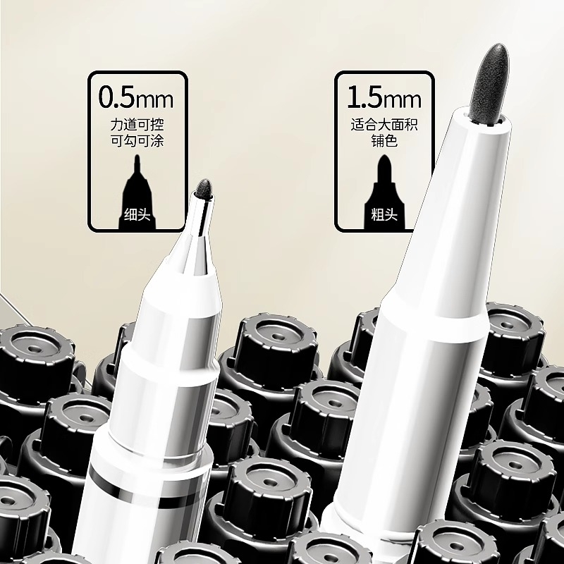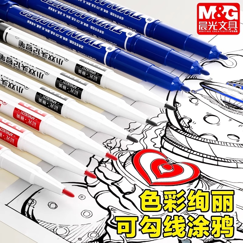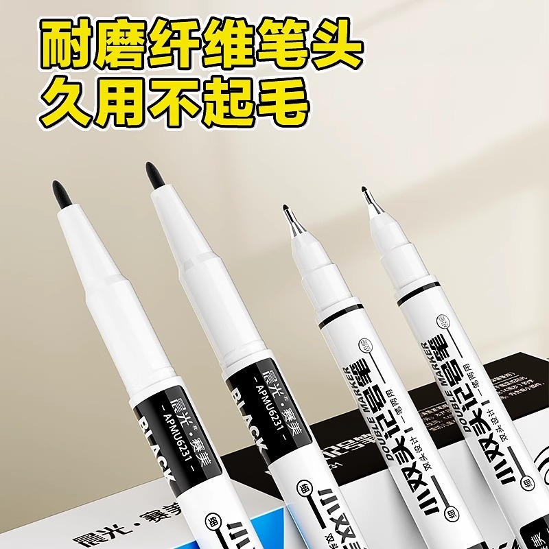晨光双头记号笔勾线笔美术专用小学生黑色油性粗细儿童幼儿园马克笔描边速干防水防油工地不掉色红色蓝色瓷砖