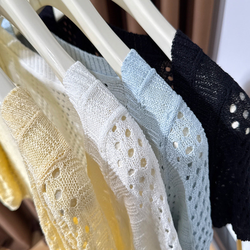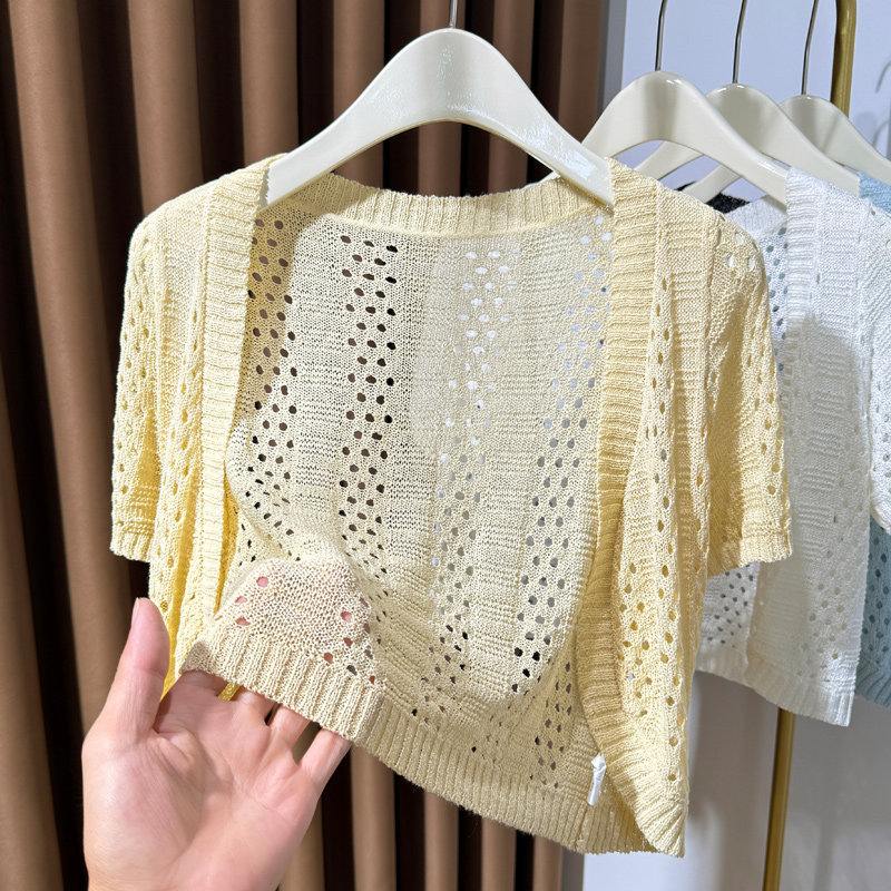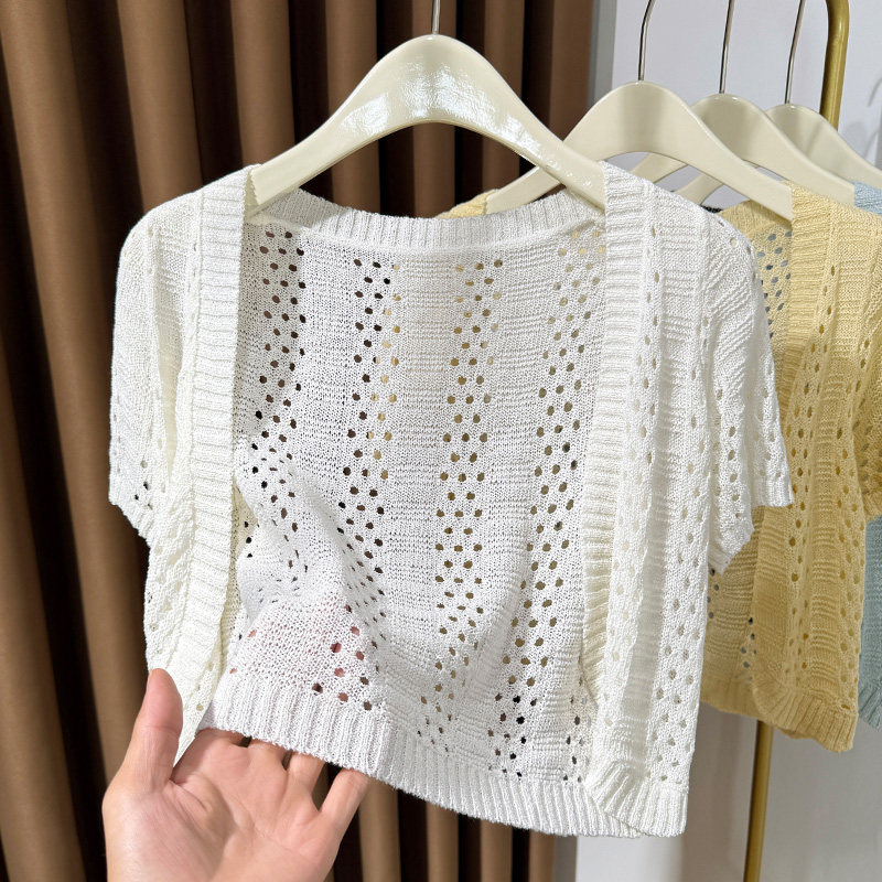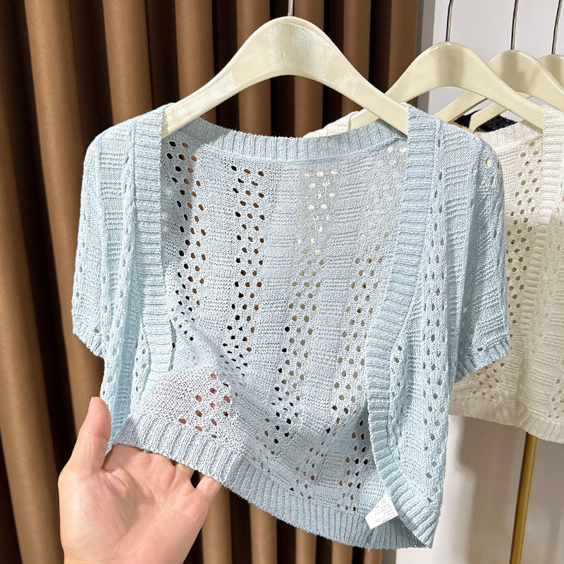 黑色轻薄针织短袖开衫女夏季披肩短款吊带裙小外搭高级感镂空罩衫