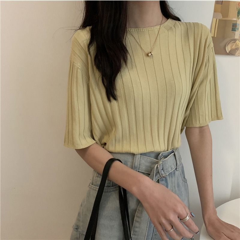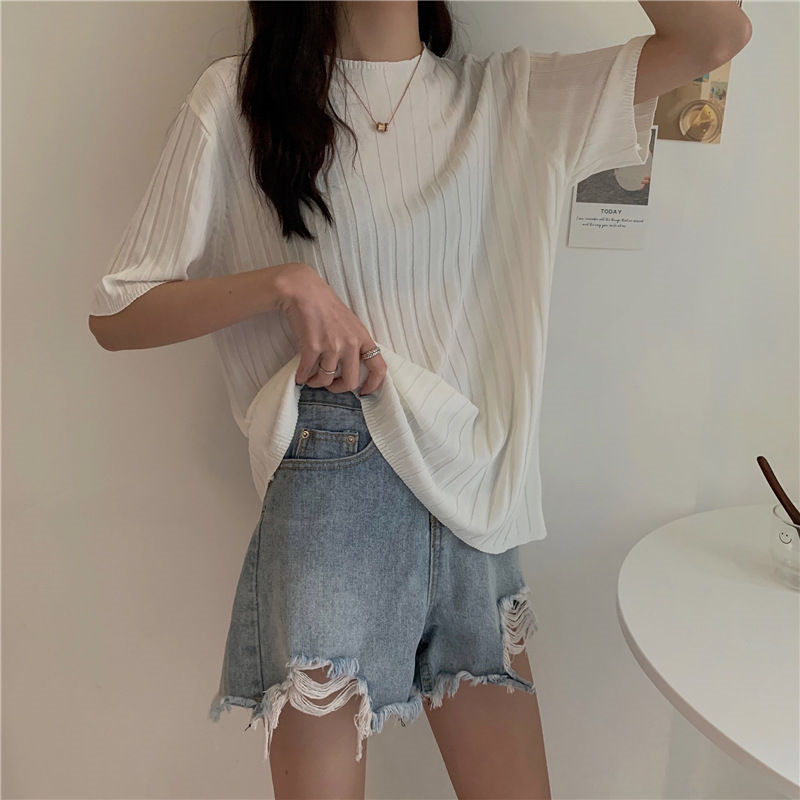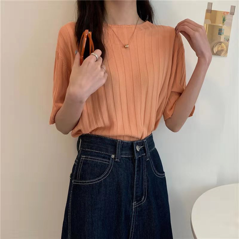冰丝t恤女薄款短袖针织衫2023大码宽松显瘦中袖打底圆领休闲上衣