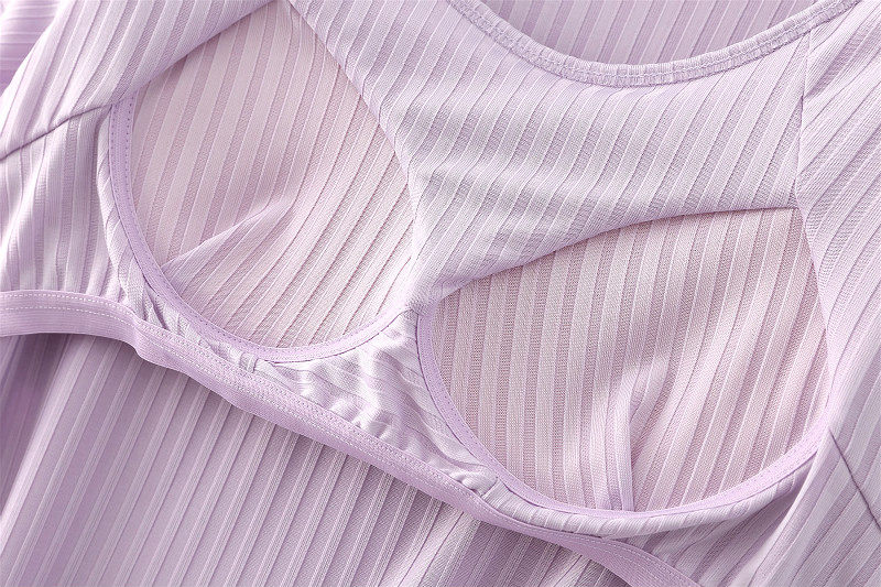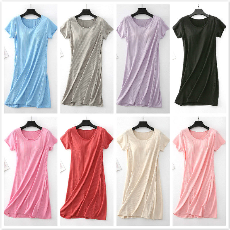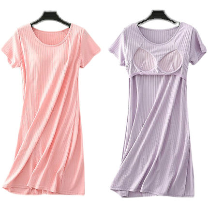 带胸垫螺纹冰丝连衣裙短袖睡裙半袖睡衣女夏季宽松免穿文胸家居服
