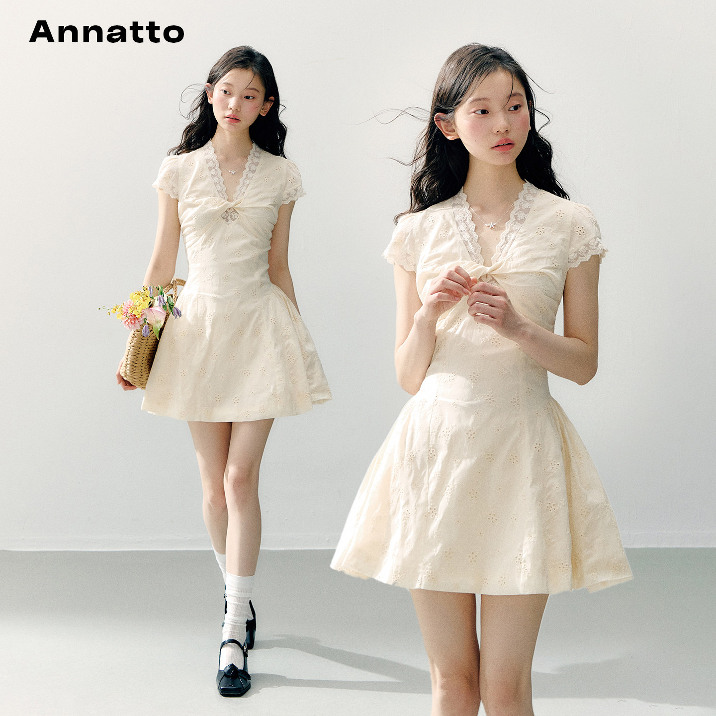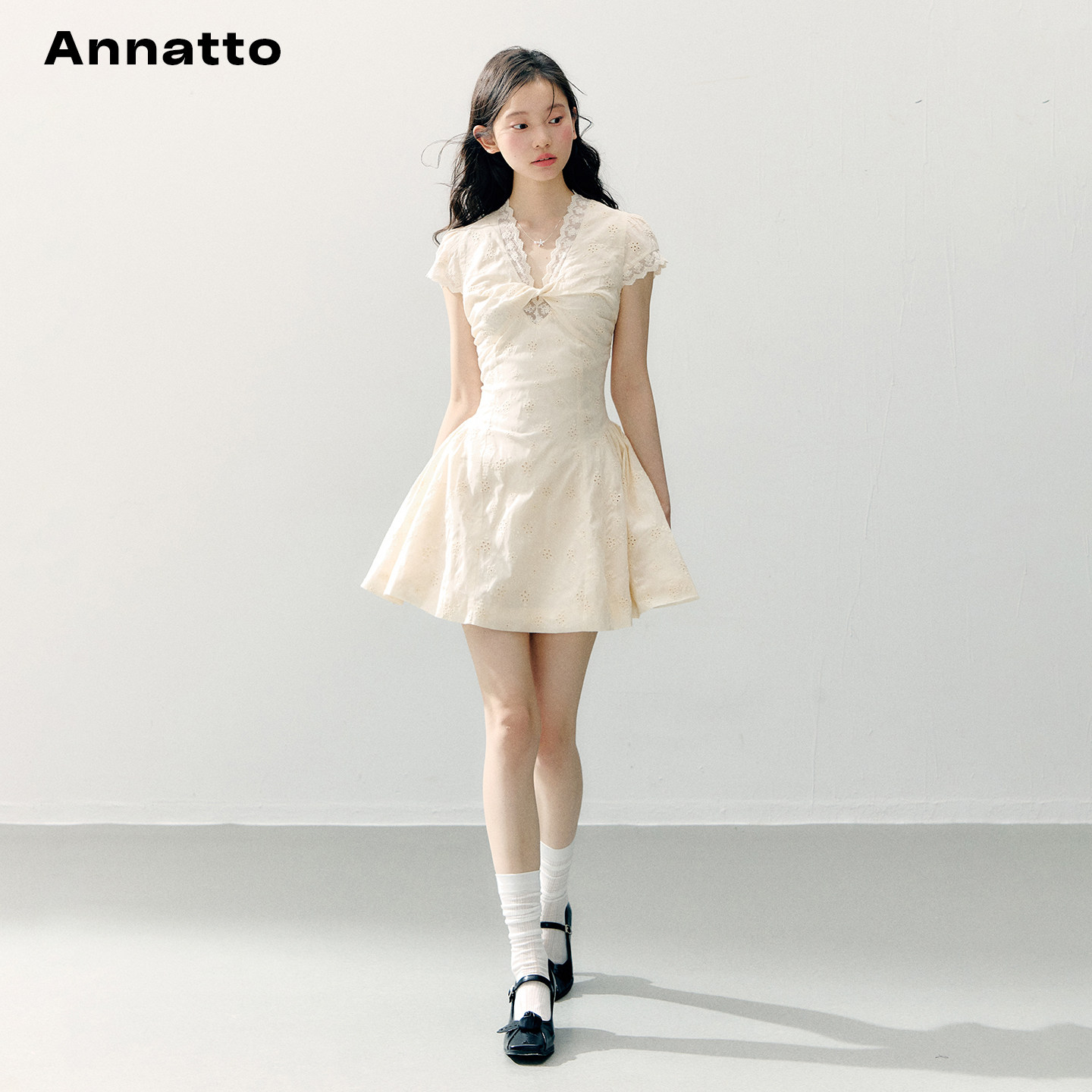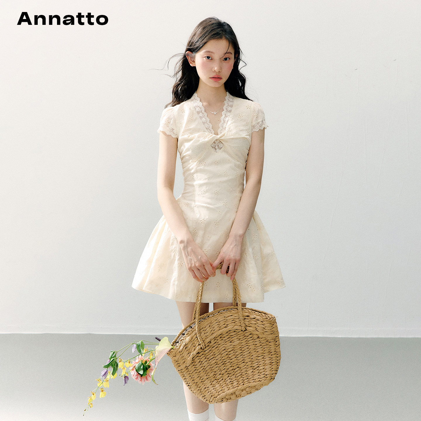 ANNATTO 茉莉苔痕 少女感米白色绣花V领蕾丝花边a字收腰连衣裙女