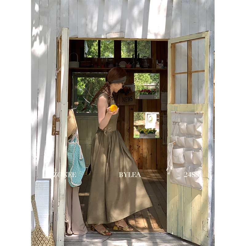 ZONEE 美式森林 法式原创气质时髦感夏日无袖微透长款绿色连衣裙