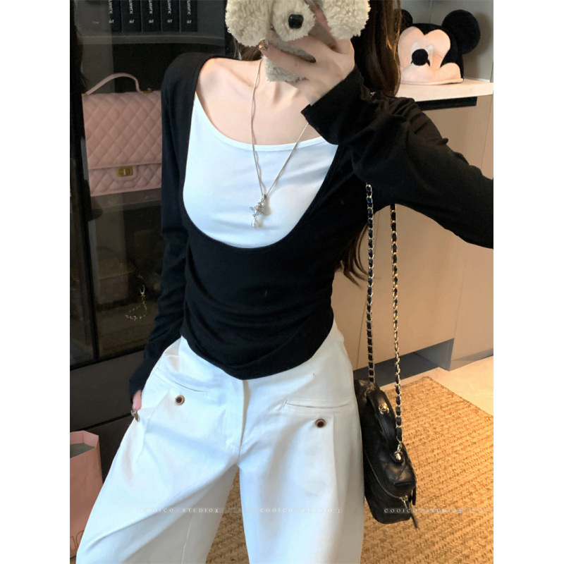 假两件撞色条纹长袖T恤女早秋修身打底衫内搭chic甜辣妹短款上衣