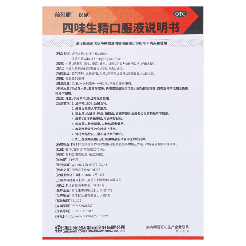 康恩贝汉威前列康四味生精口服液fs温补肾阳生精阳虚益气otc淘