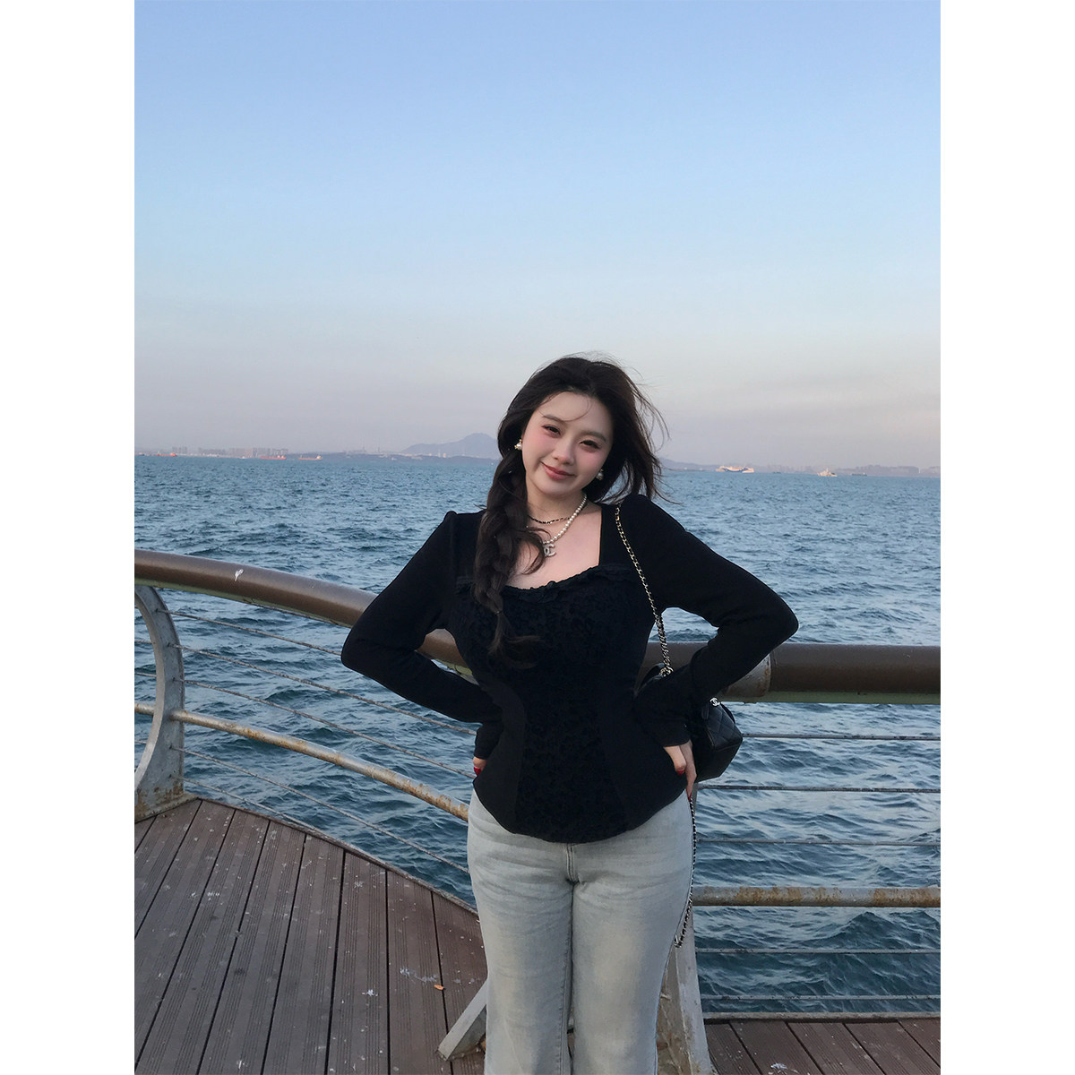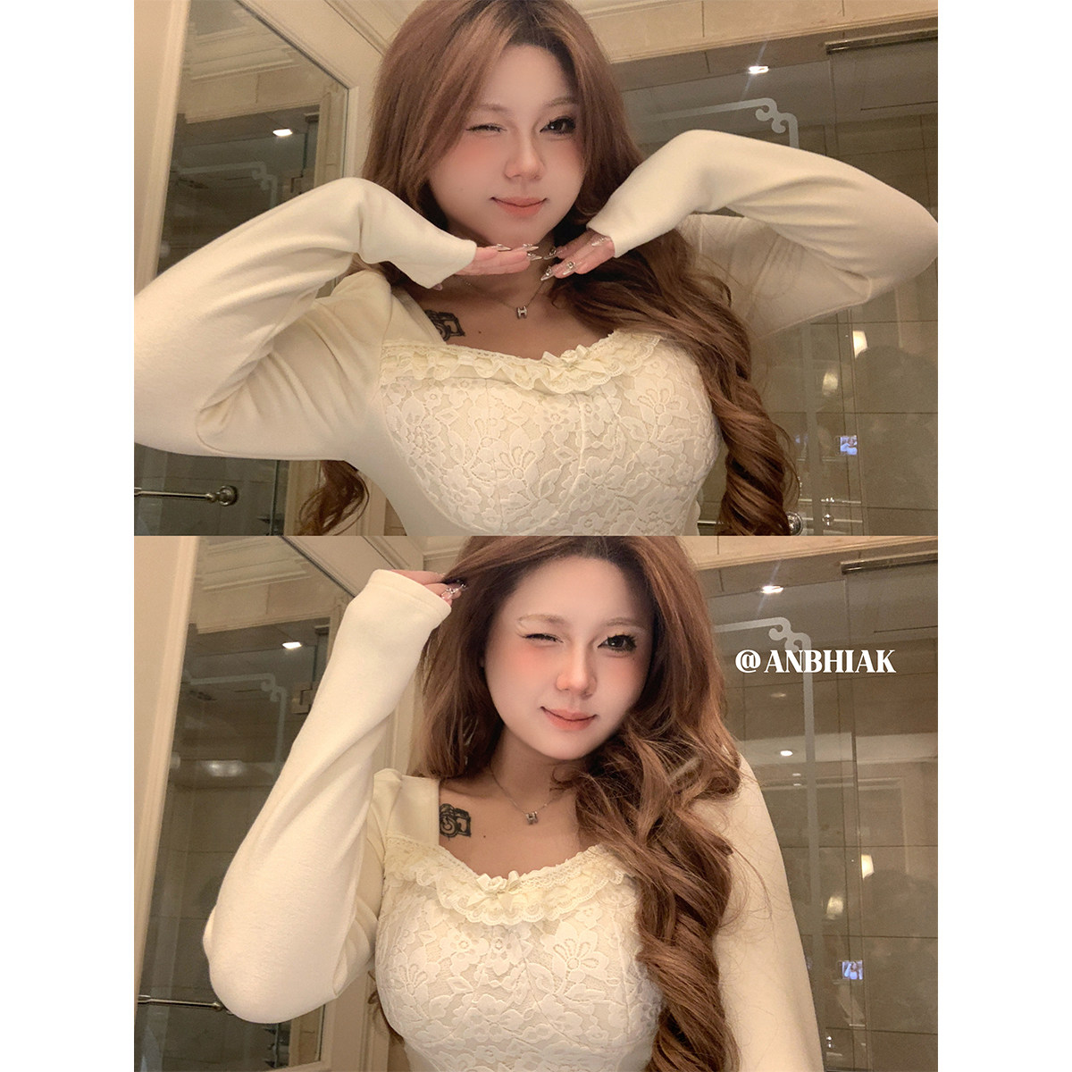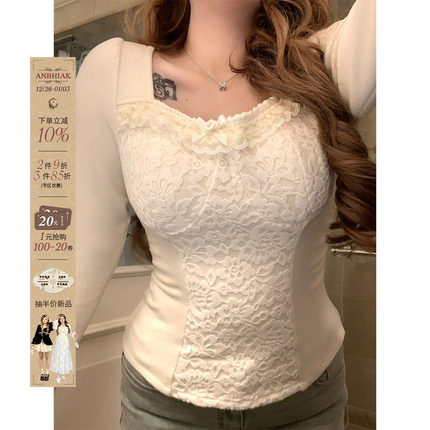安妮不火 雪尼尔蕾丝拼接双面磨毛针织衫女微胖大码收腰长袖上衣