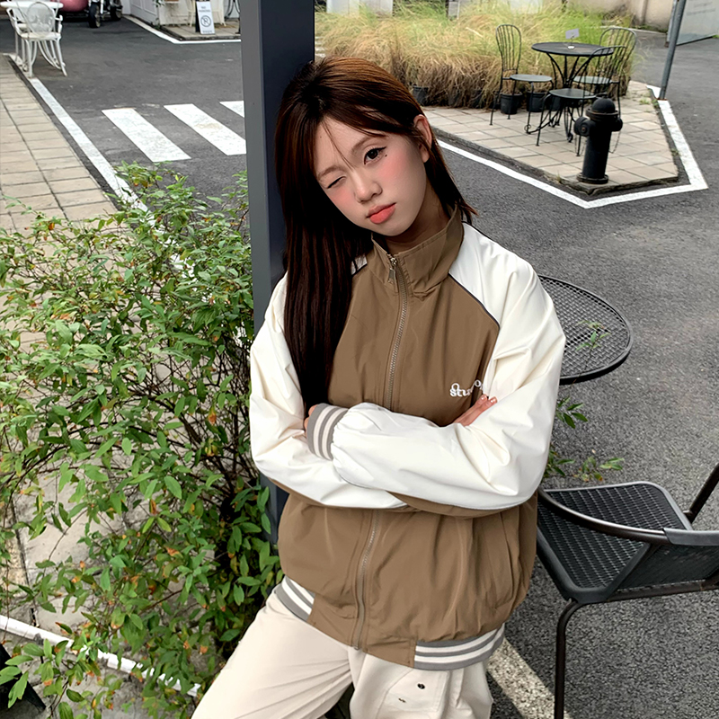 橘子树在哪儿美式复古撞色拼接棒球服女春秋宽松休闲立领运动外套