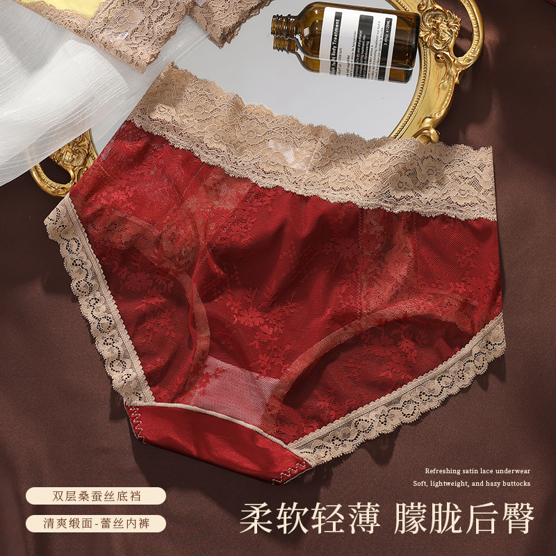 千色年华轻奢淑女缎面女士内裤中腰拼接蕾丝边大码舒适包臀三角裤