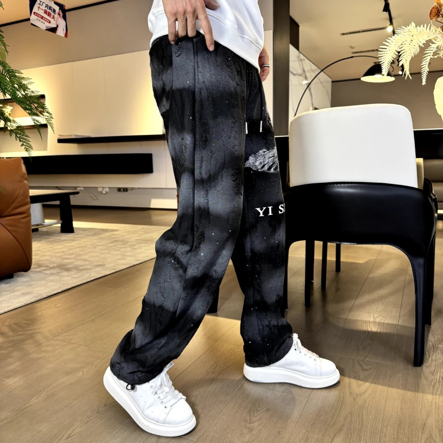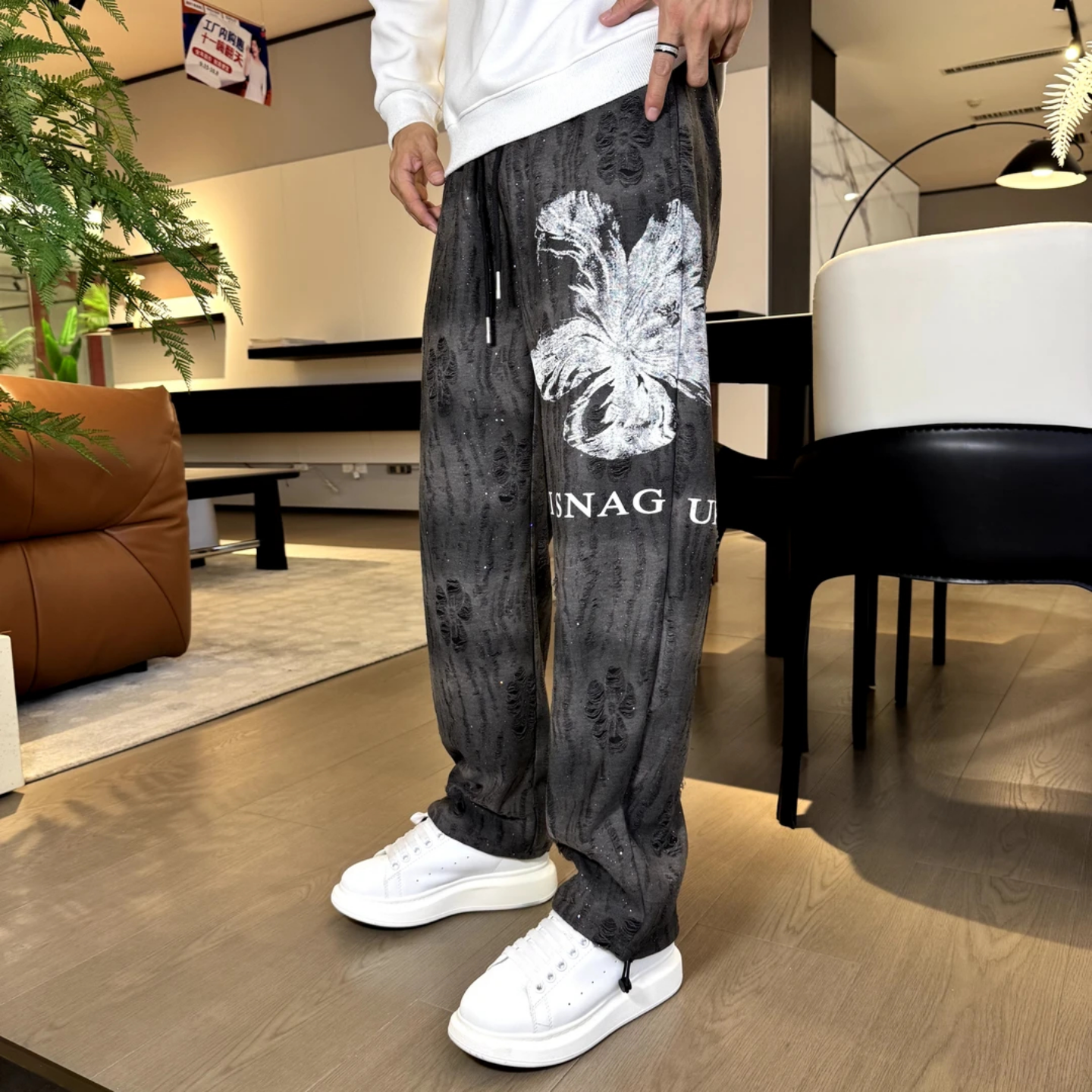 秋季新款男士直筒裤时尚潮流扎染泼墨破洞风格长裤休闲裤小众设计
