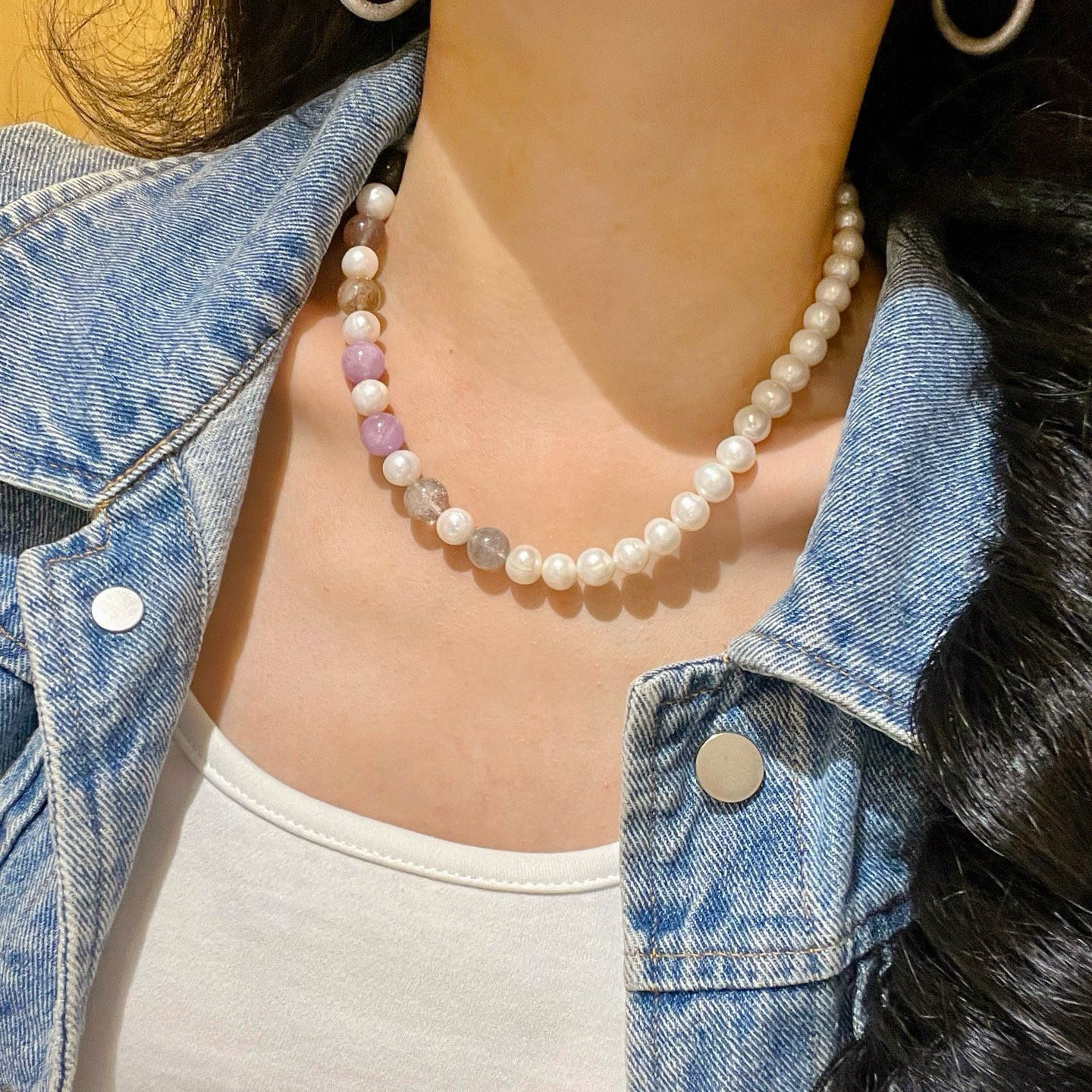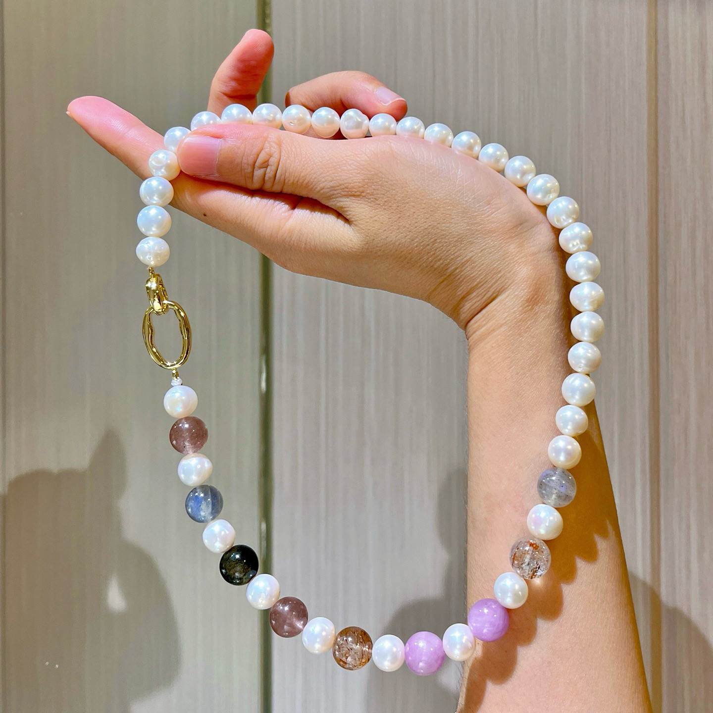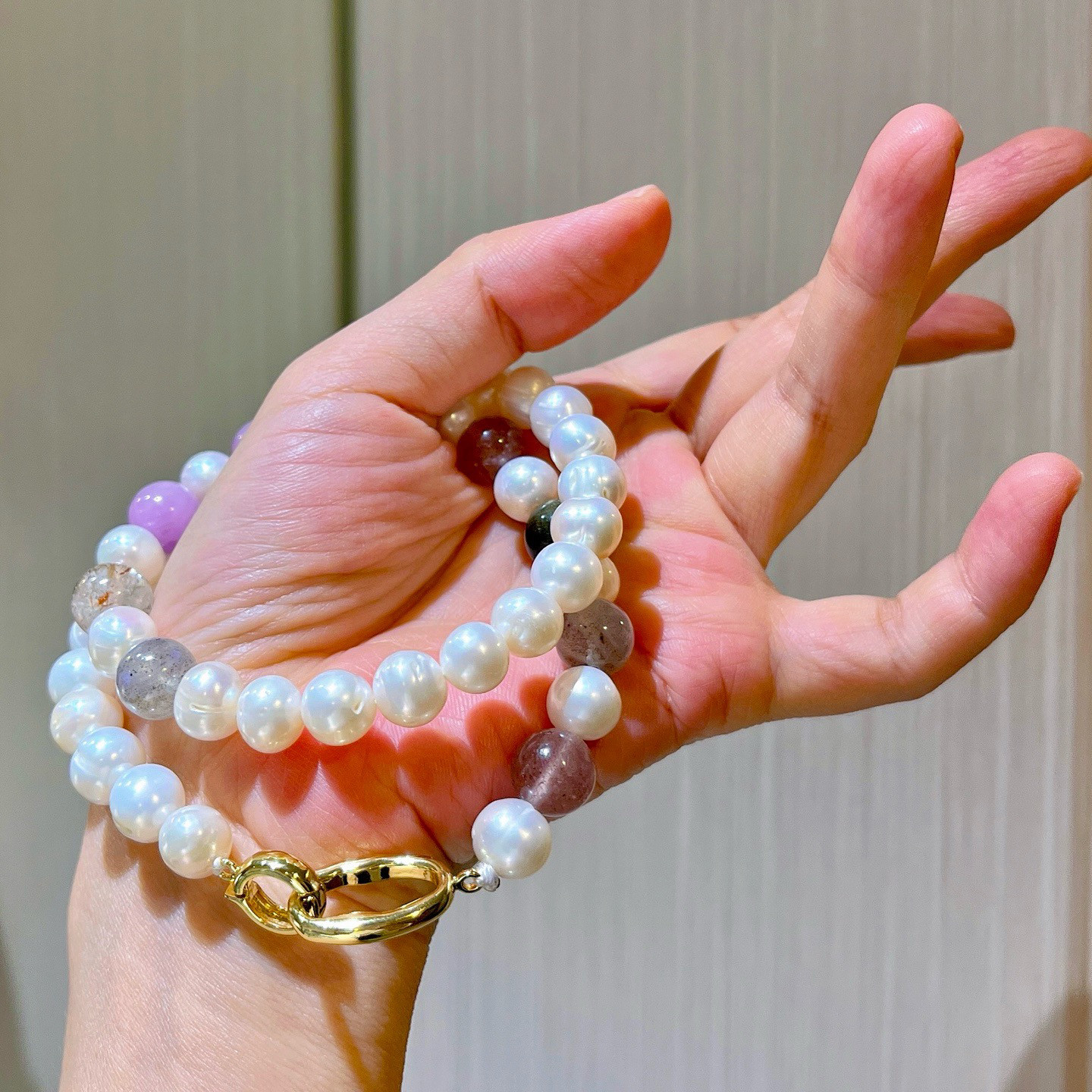 9-10mm天然淡水珍珠月光石紫锂辉黑金超七草莓晶设计感项链锁骨链