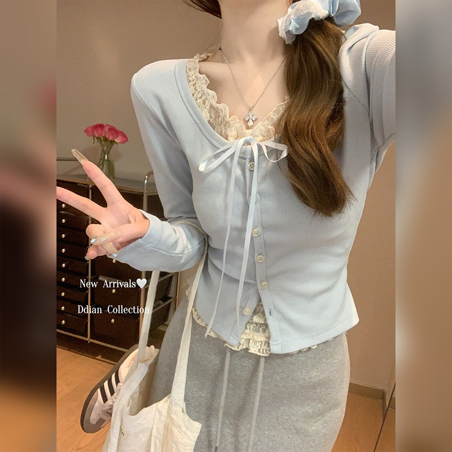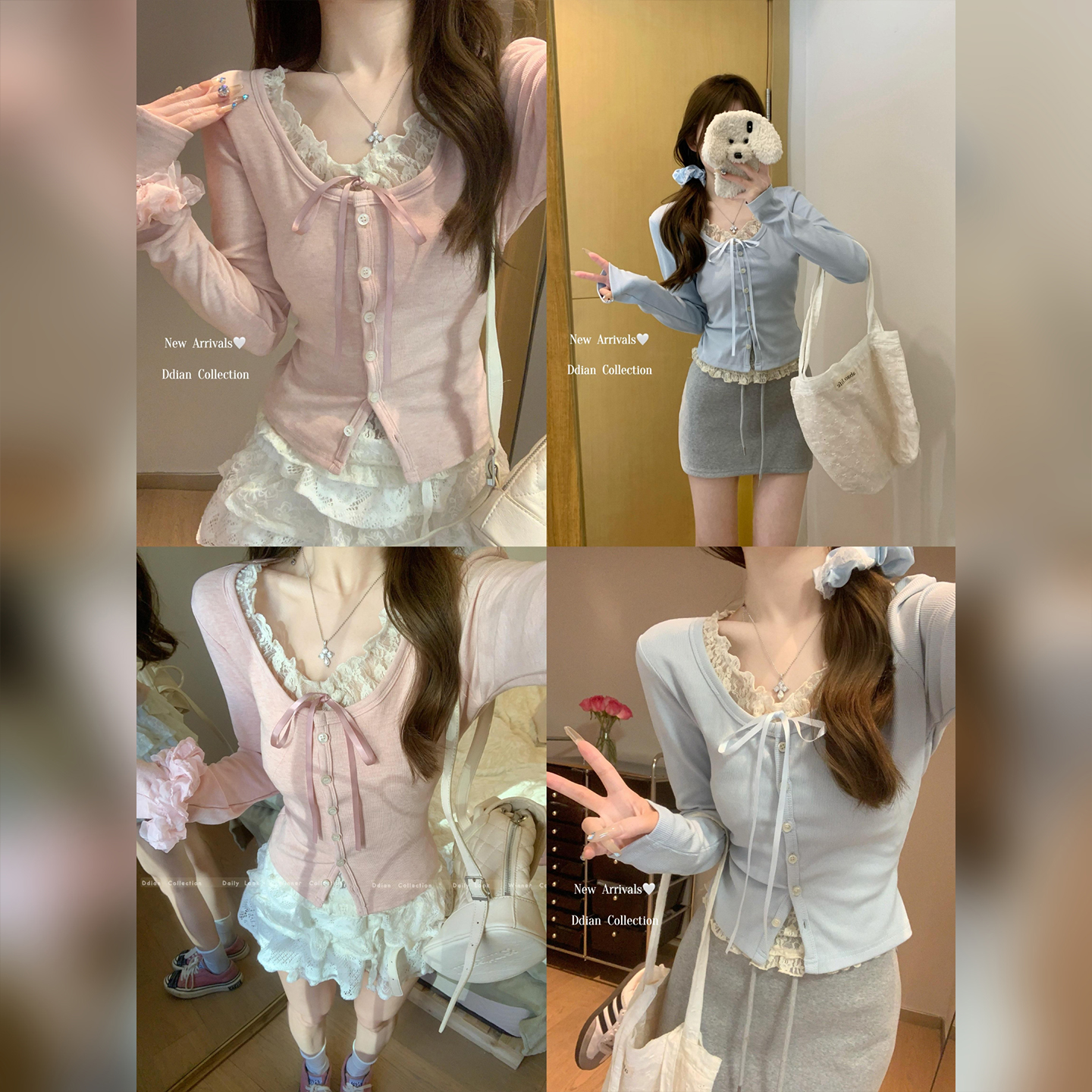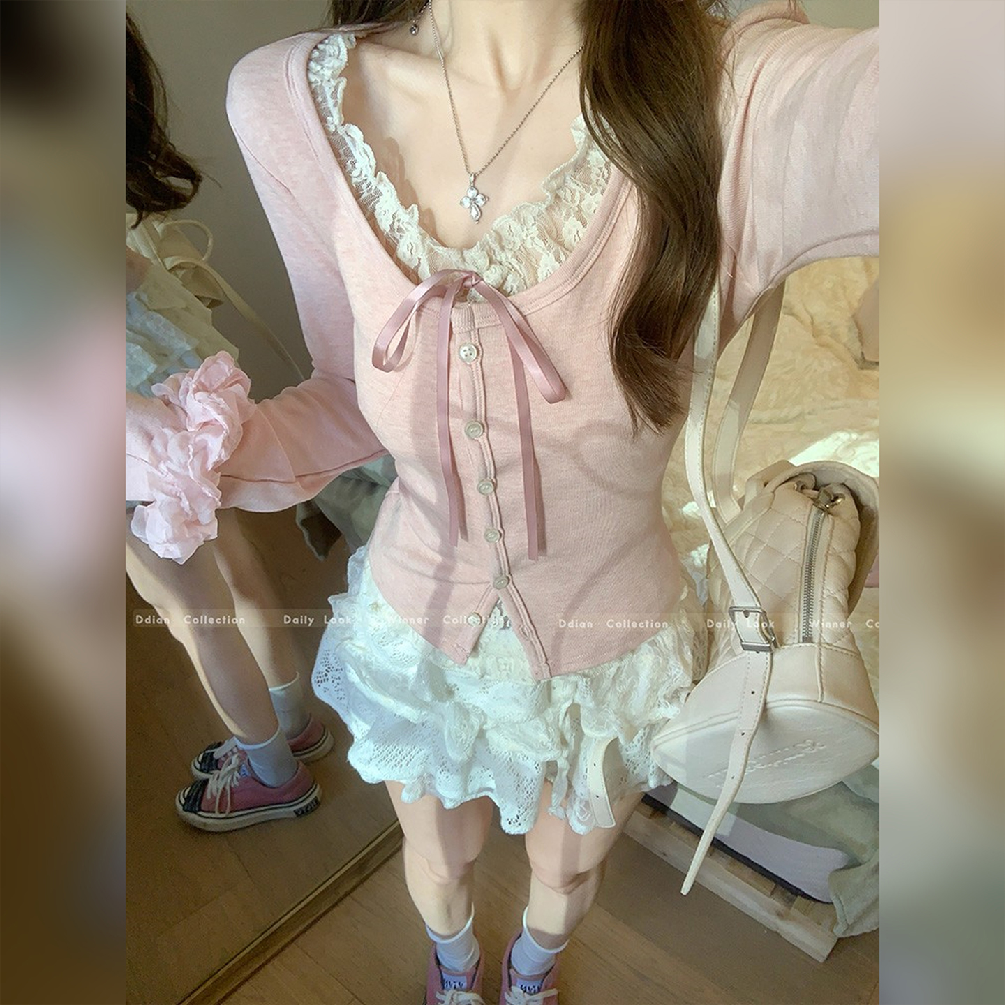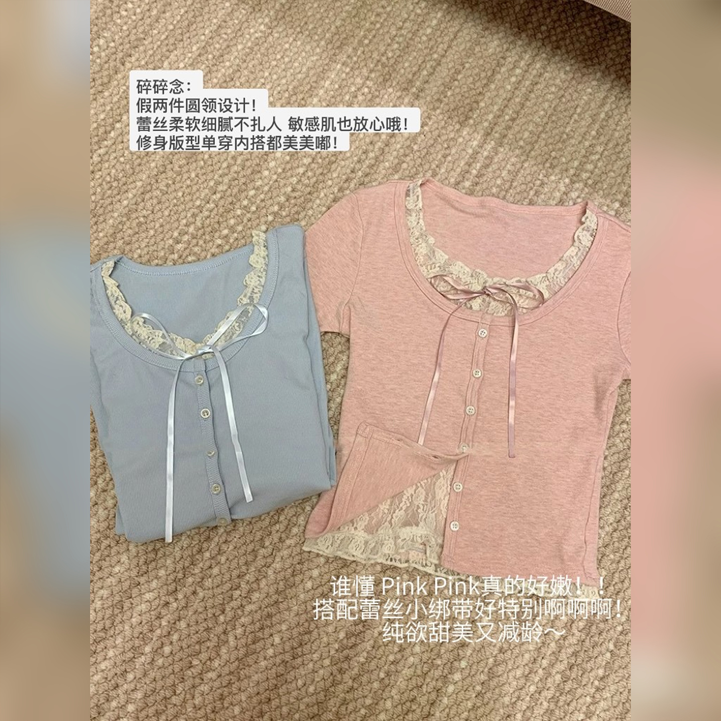 NR真维斯早秋假两件粉色蕾丝拼接长袖T恤女针织衫打底内搭bm上衣