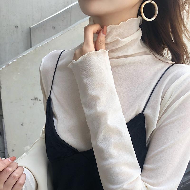 高领蕾丝打底衫女秋季覆古显瘦长袖网纱T恤衫木耳边内搭上衣1027r