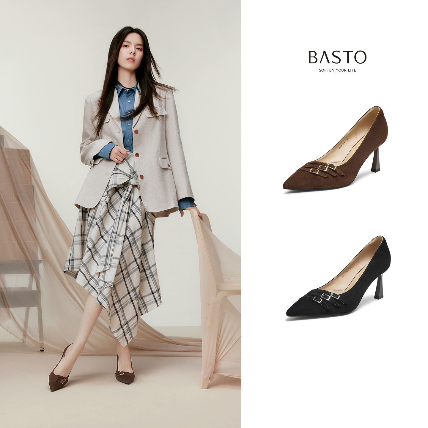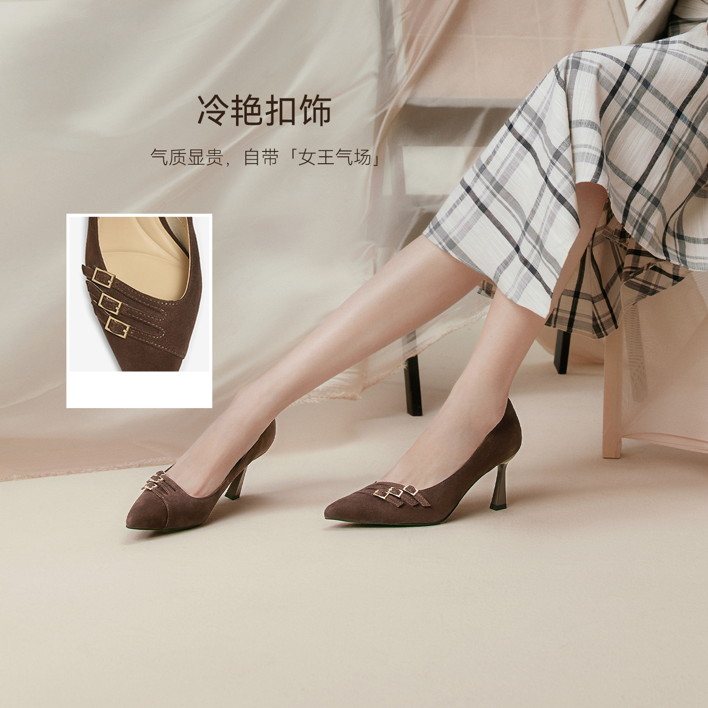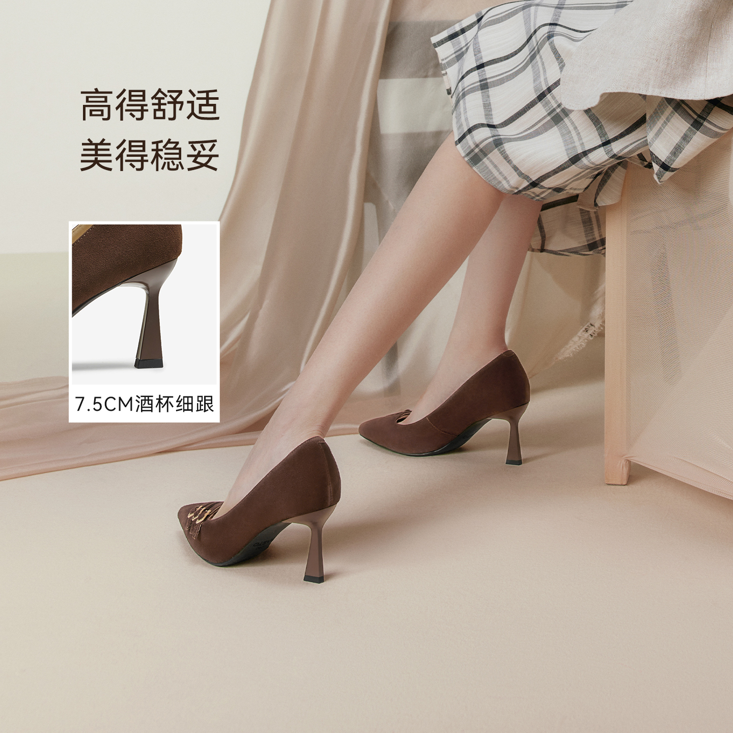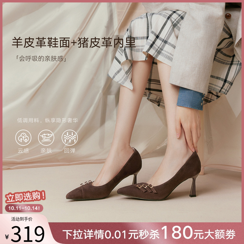 百思图2025秋季新款舒适羊皮高跟鞋浅口单鞋通勤尖头女鞋AQ352CQ5