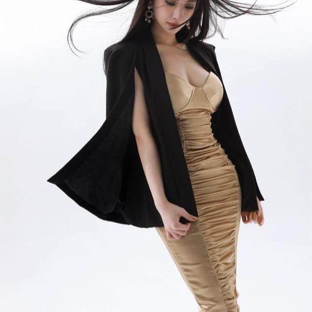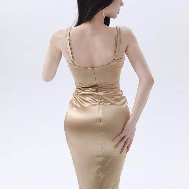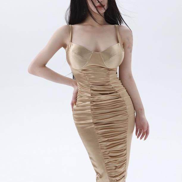 孙智惠 吊带抹胸修身弹性金色缎面褶皱包臀裙一步连衣裙