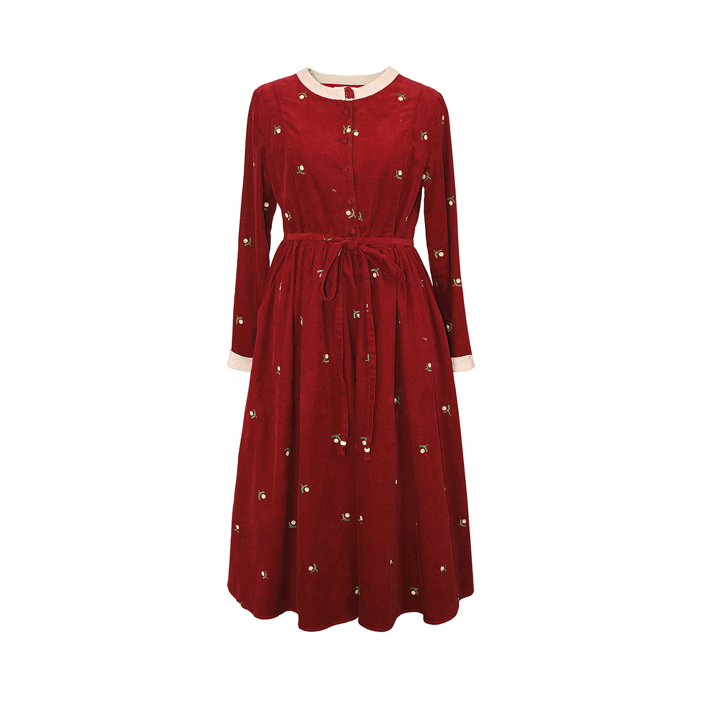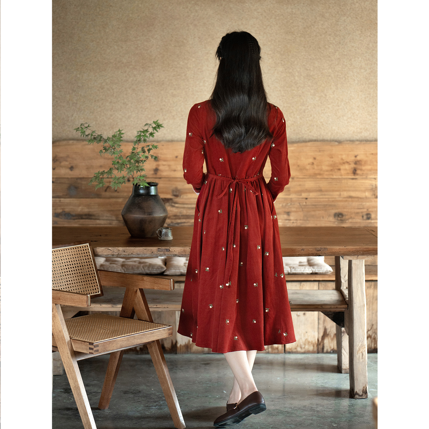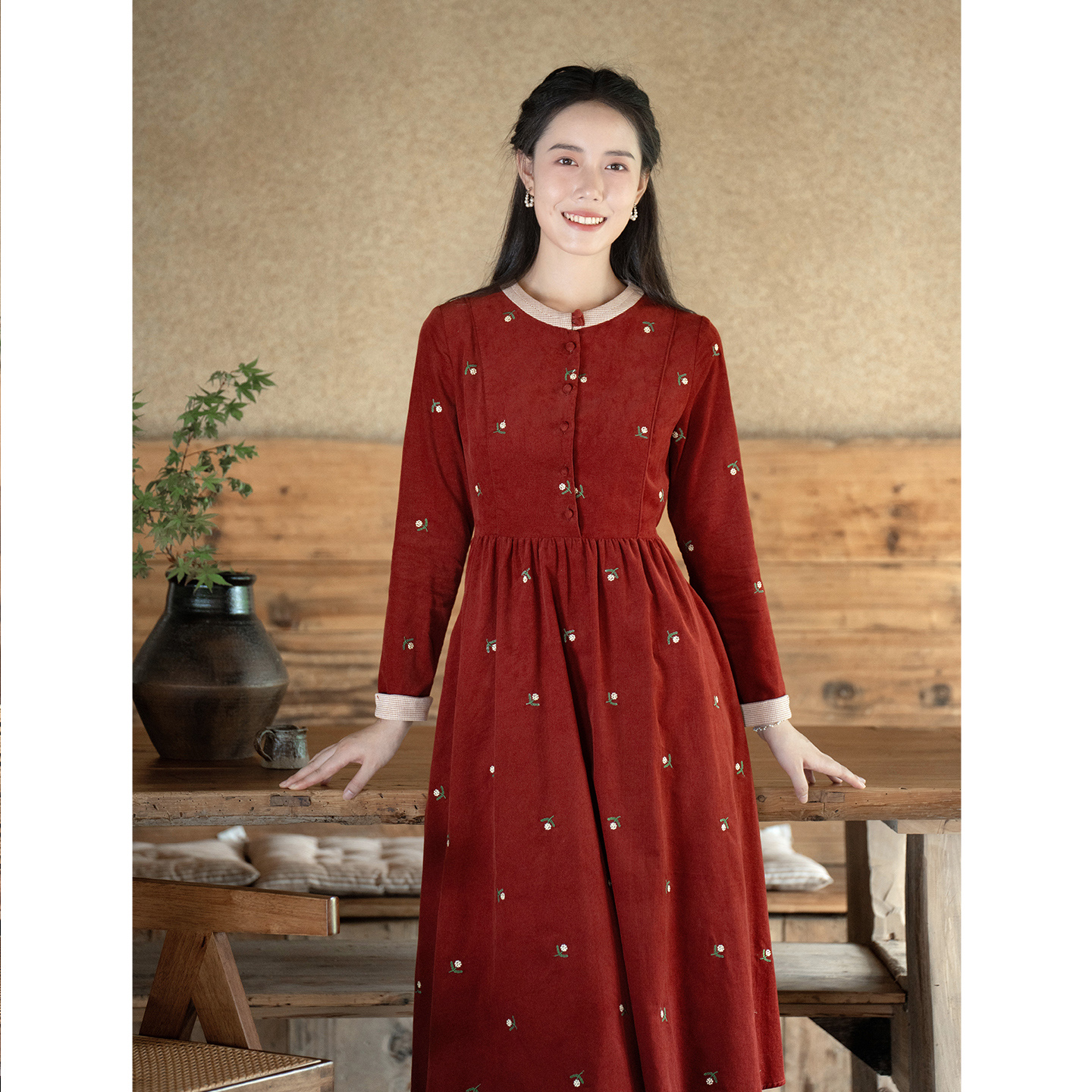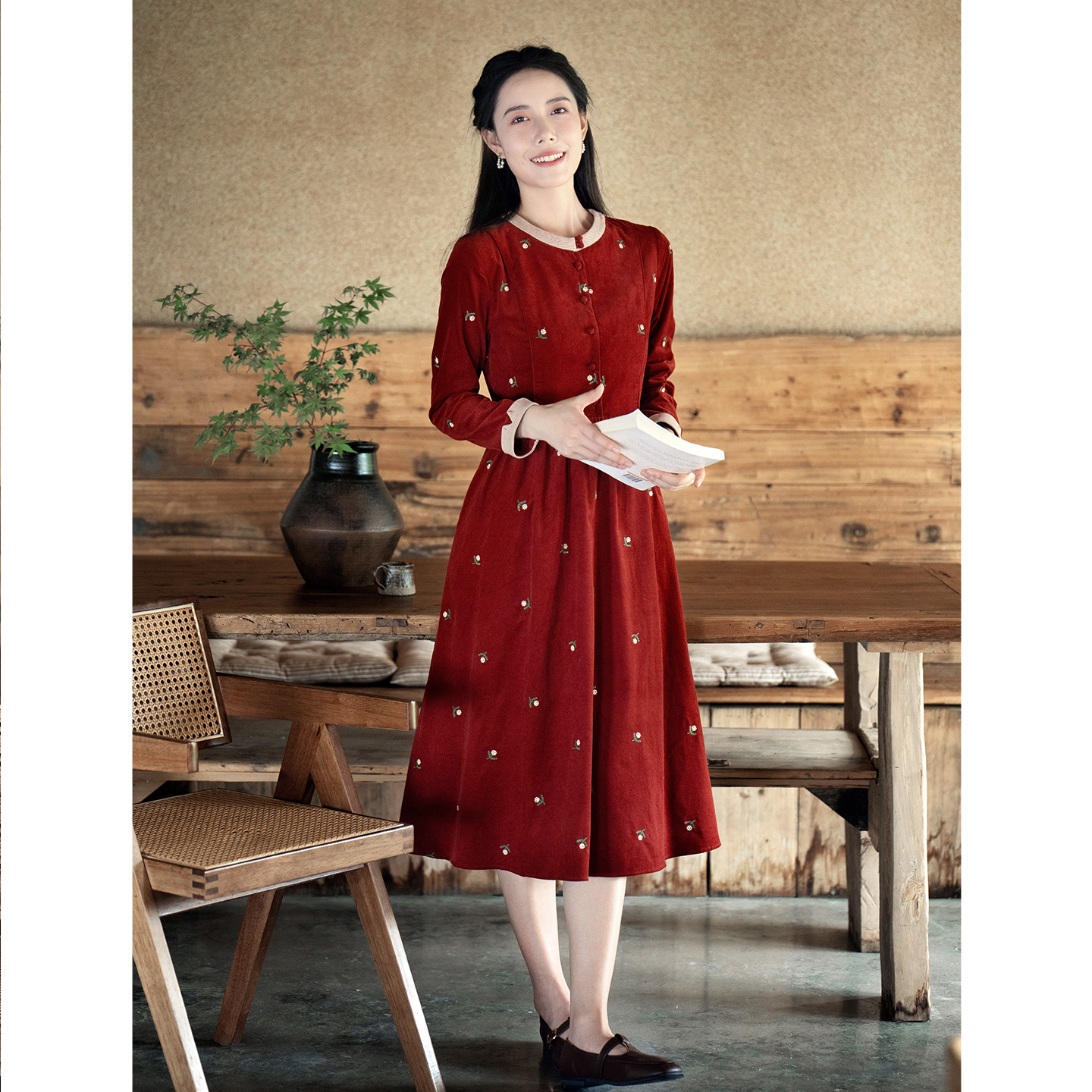 纻衣复古橘色纯棉刺绣文艺田园长袖连衣裙女2025秋季新款修身显瘦