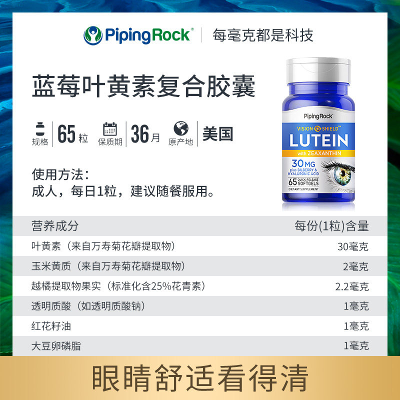 美国朴诺叶黄素软胶囊进口蓝莓片护眼丸专利护眼保健品30mg65粒