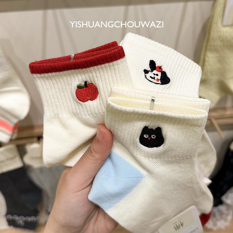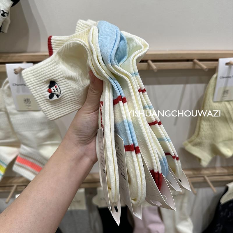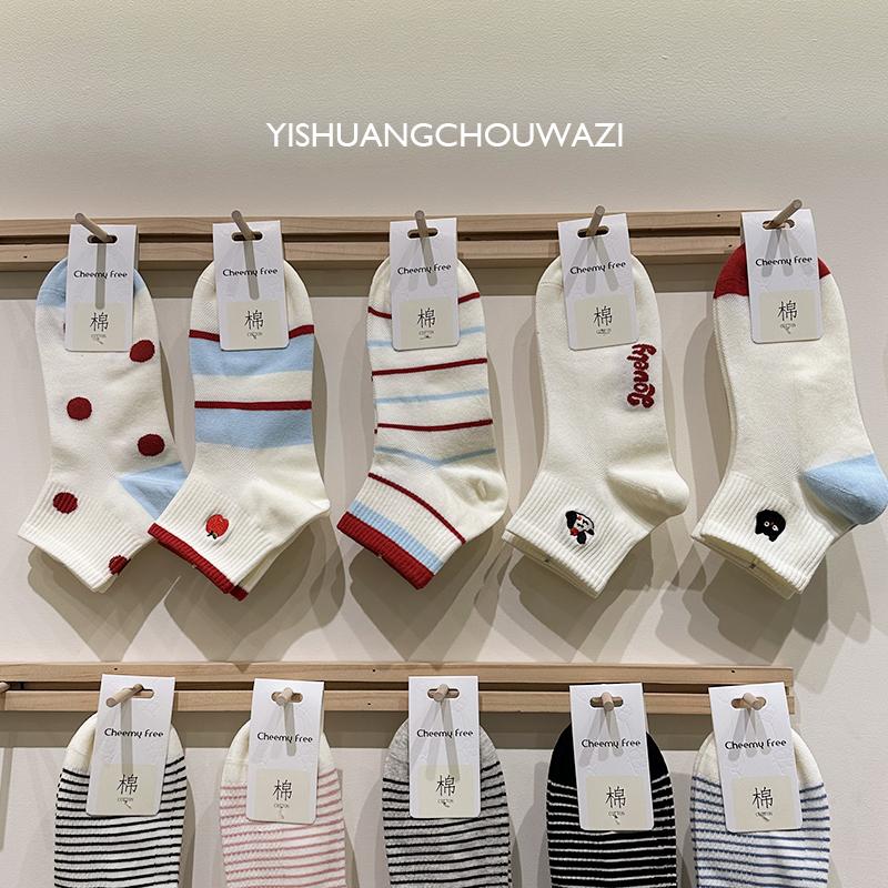 2025春夏新品女士可爱卡通刺绣条纹白色短筒棉袜子网眼夏季百搭潮