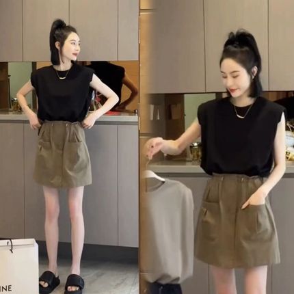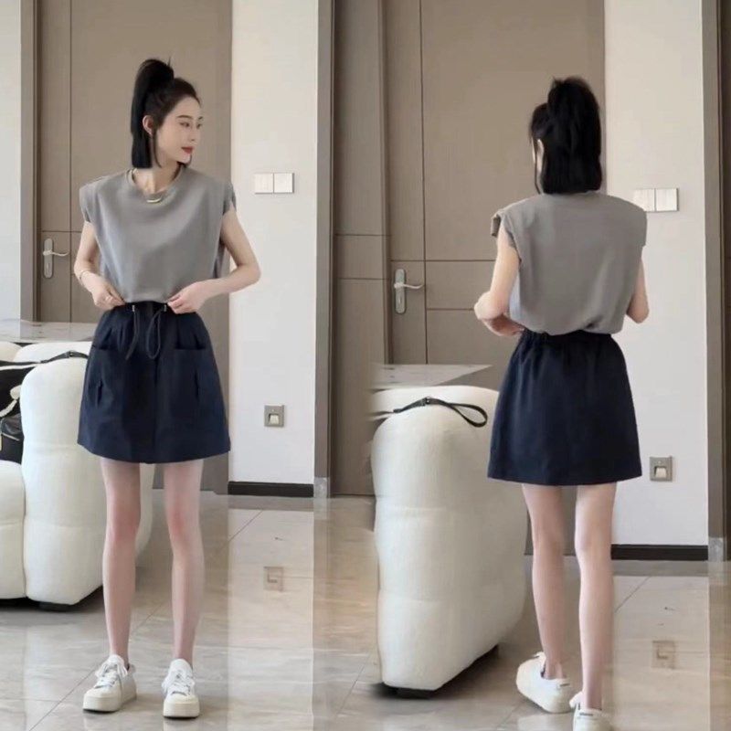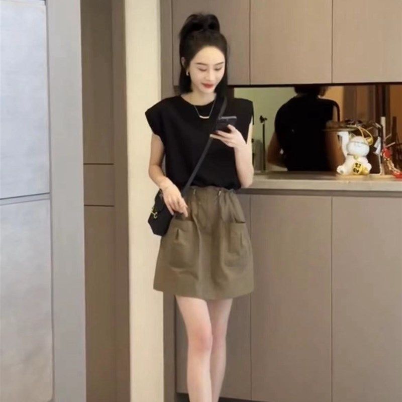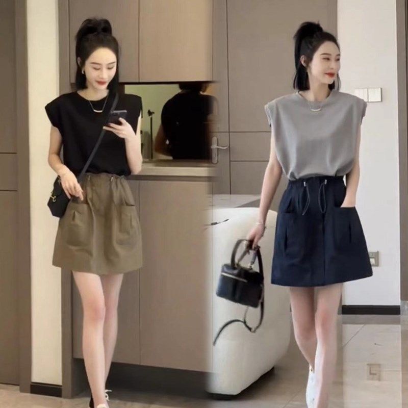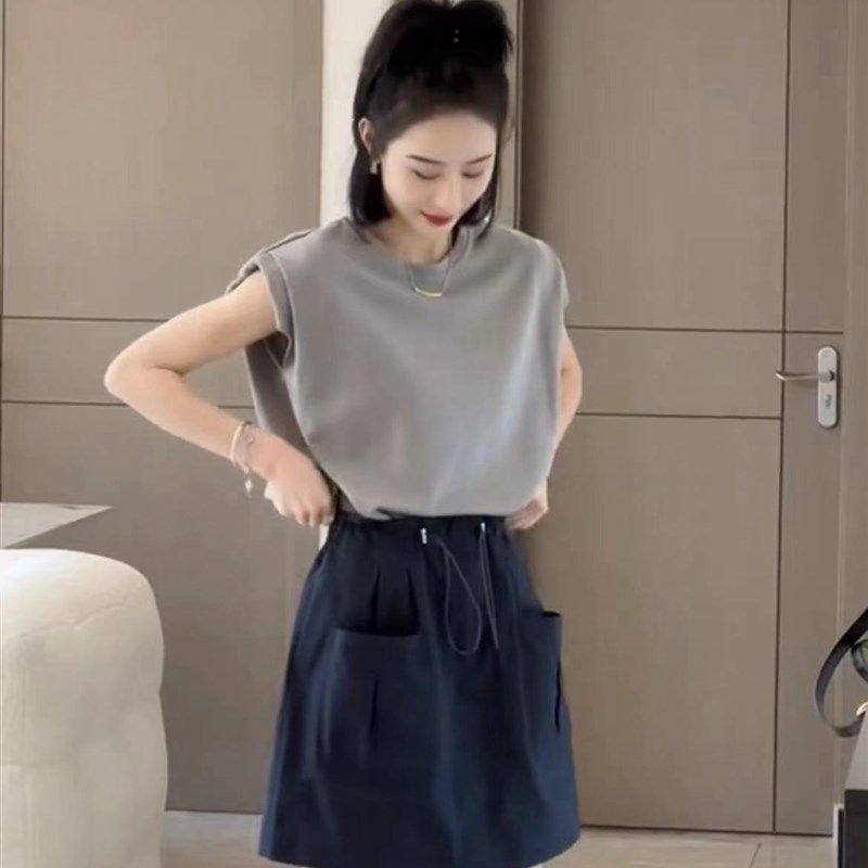 2024夏季新款休闲宽松无袖背心t恤女松紧高腰工装半身裙两件套装