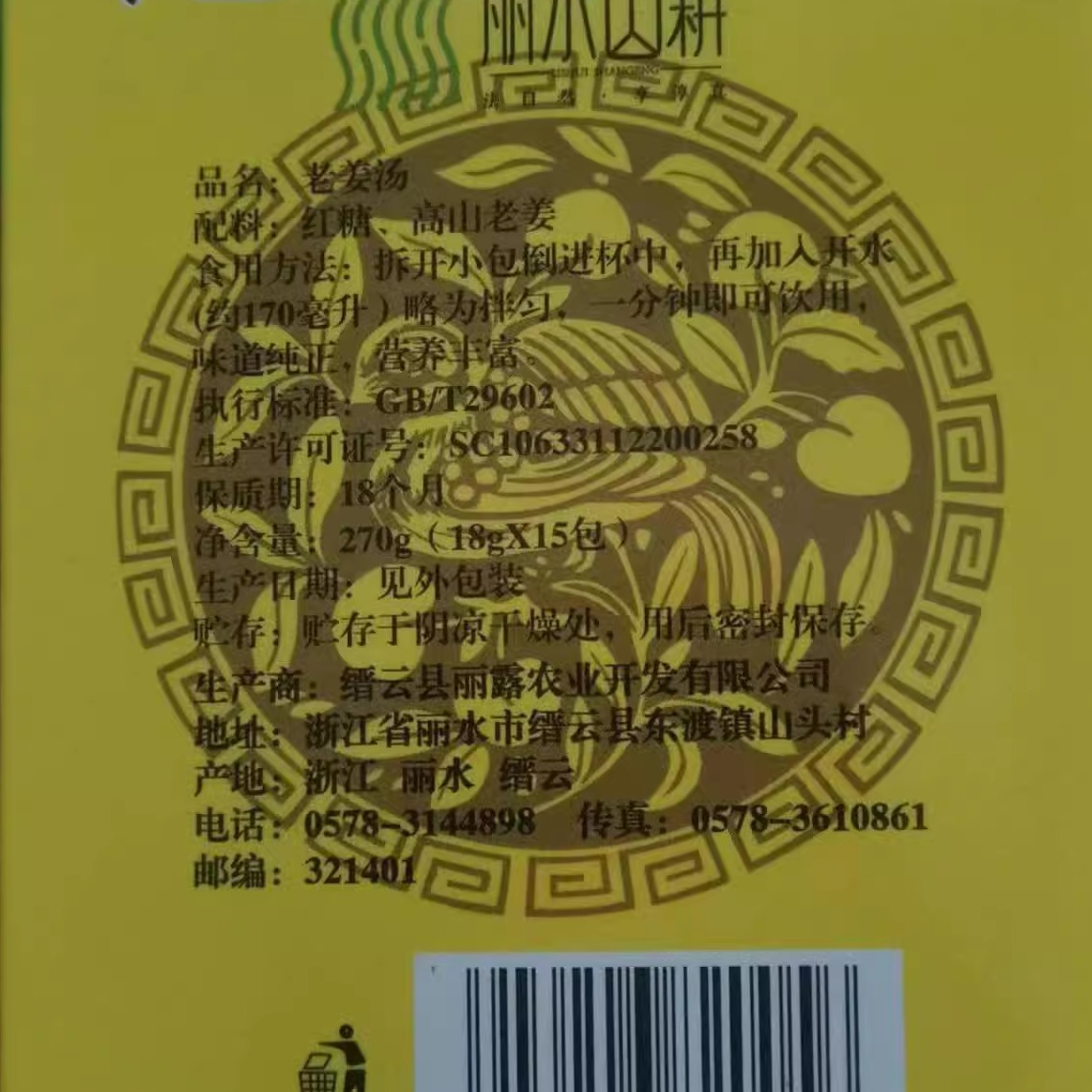缙云特产丽露老姜汤老姜茶生姜汤红糖老姜茶姜母茶270克3盒包邮