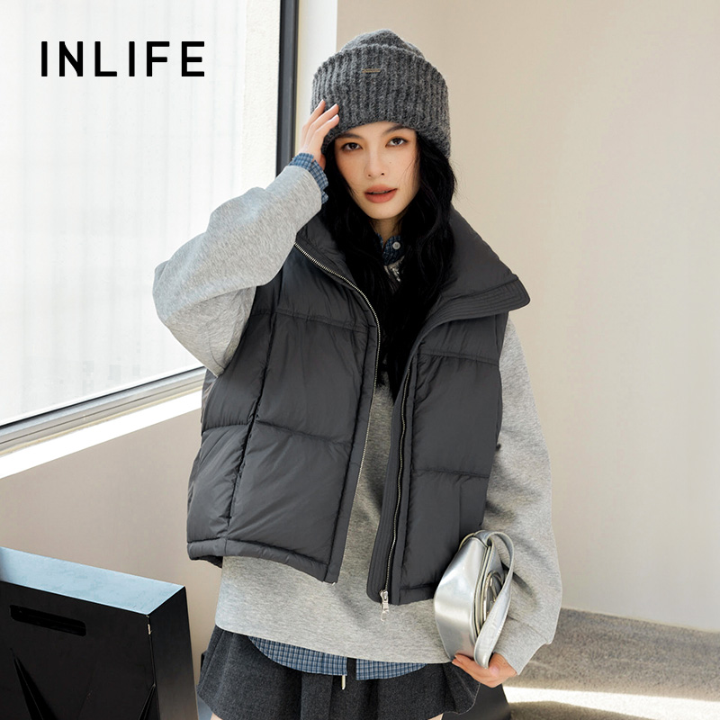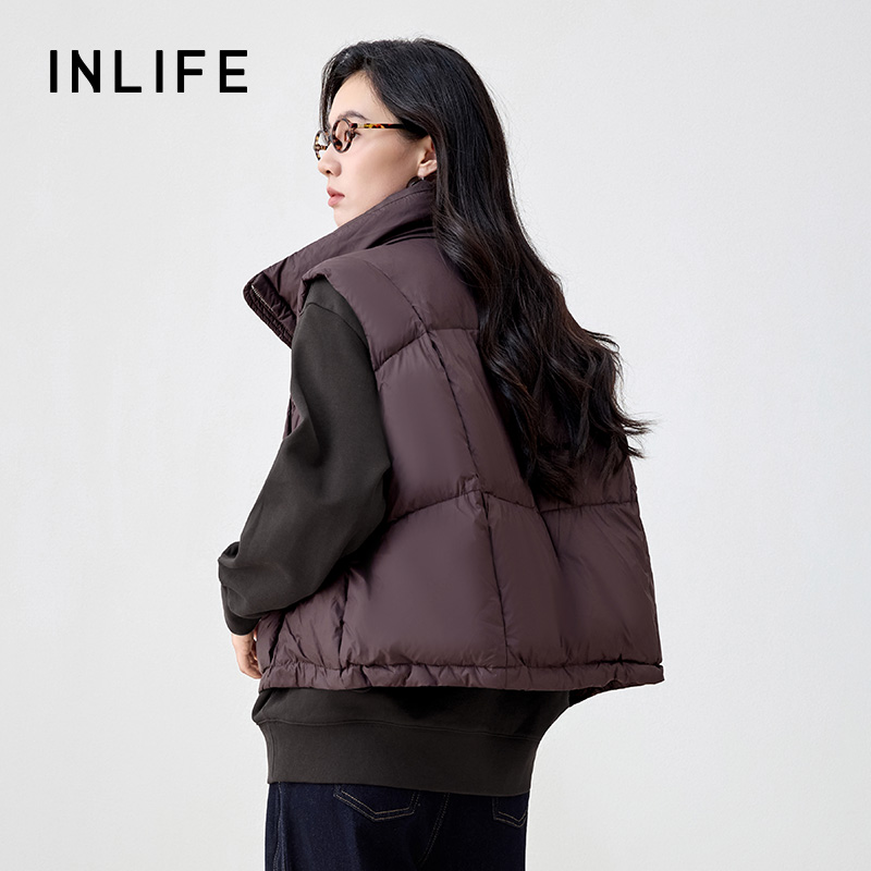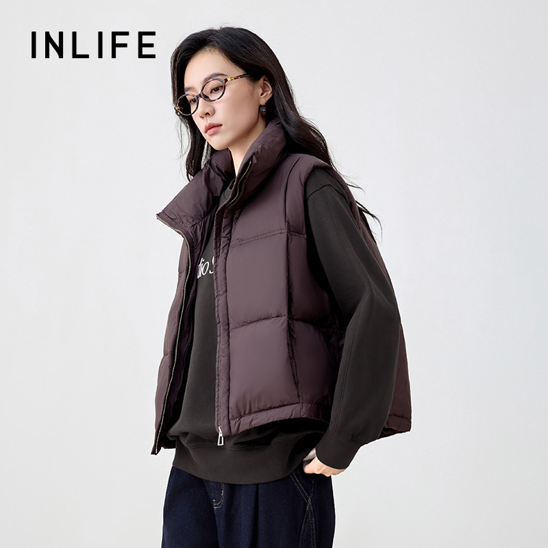 伊纳芙短款保暖鸭绒羽绒马甲女冬季新款时尚宽松休闲立领马夹外套