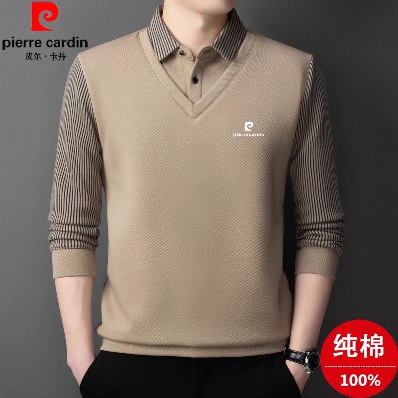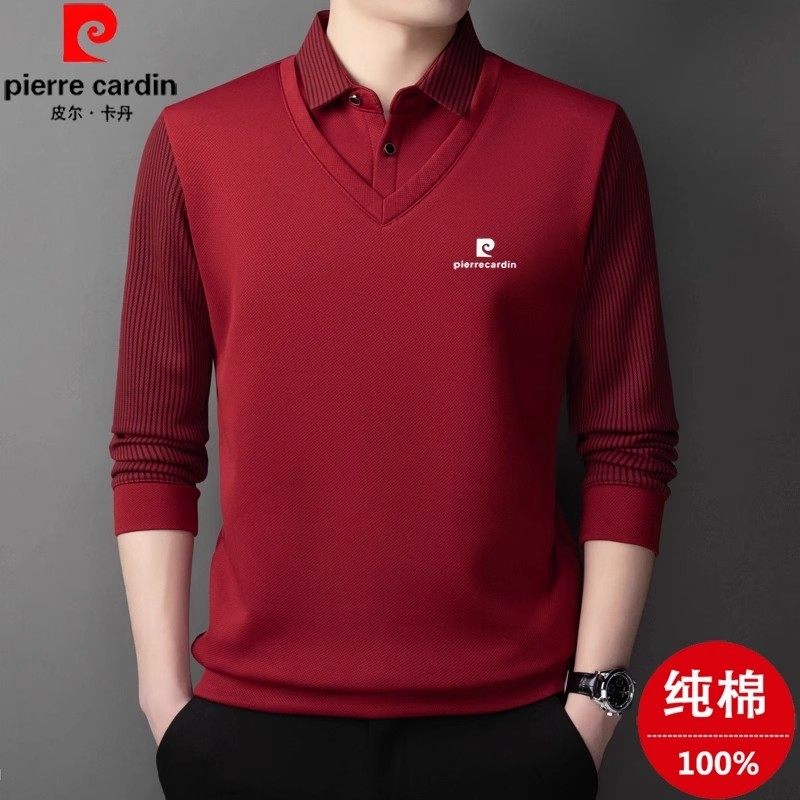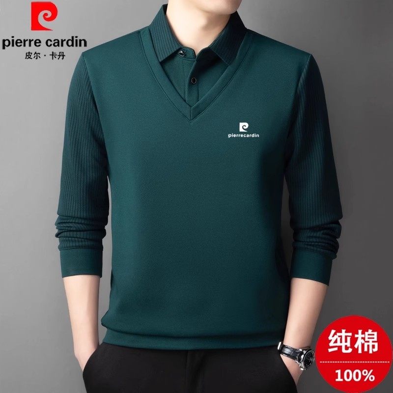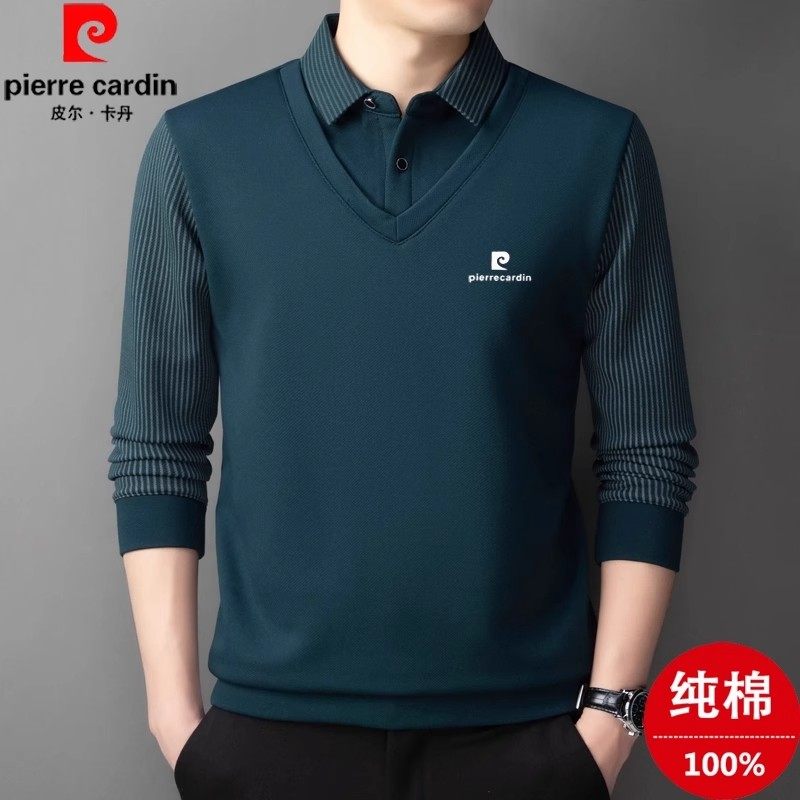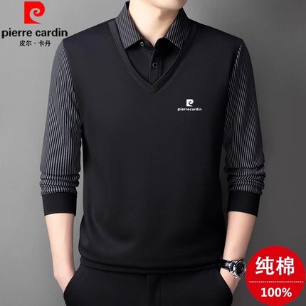 皮尔卡丹春秋新款正品纯棉长袖T恤男士衬衫领加绒假两件Polo衫男