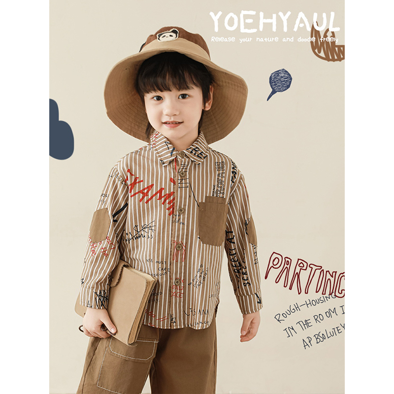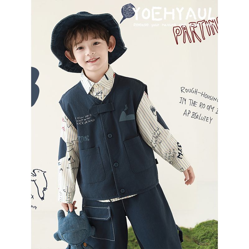 幼悠男童春季新款涂鸦长袖衬衫无袖马甲宽松休闲裤户外工装风套装