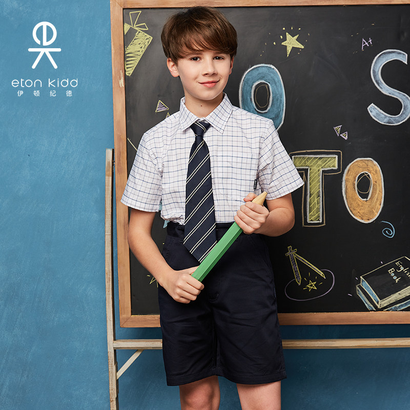伊顿纪德校服 童装夏男童短袖格子衬衫清爽翻领衬衣09C122
