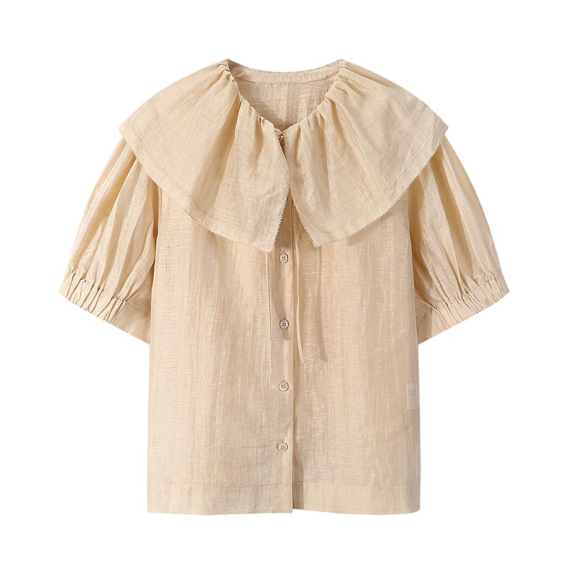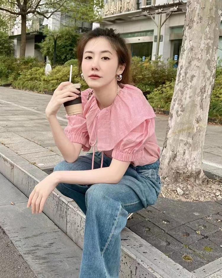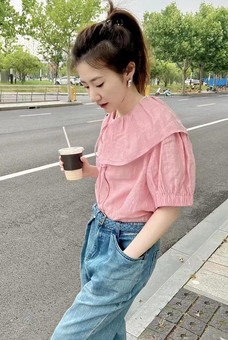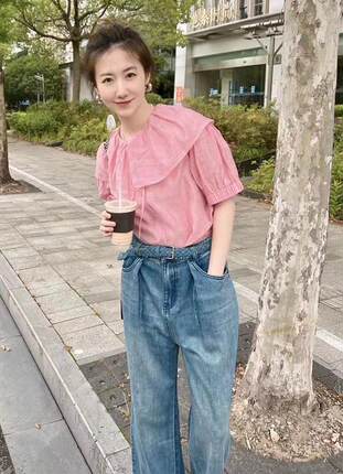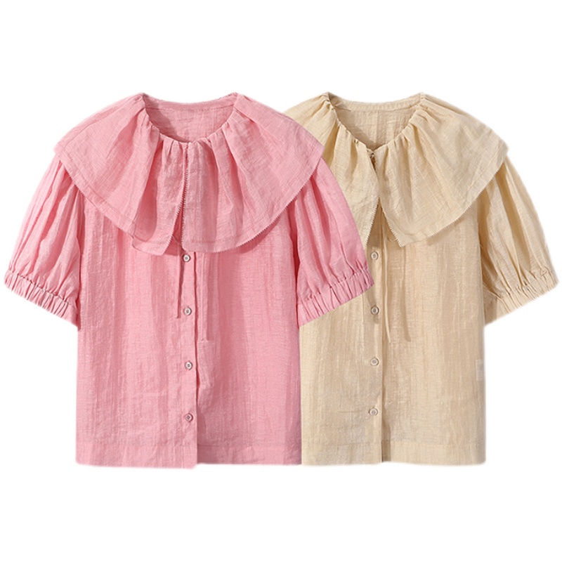 清仓特价不退不换新款法式减龄荷叶边粉色短袖衬衫上衣女