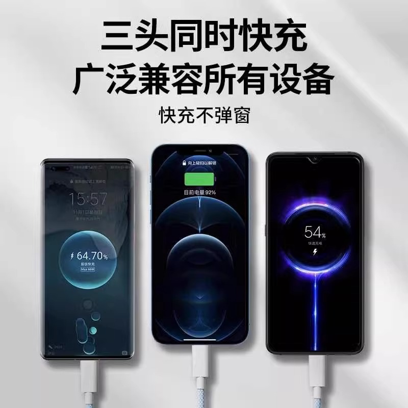 120W超级快充头三合一快充数据线适用苹果vivo华为安卓闪充手机一拖三充电器线三头多功能车载tpyec正品