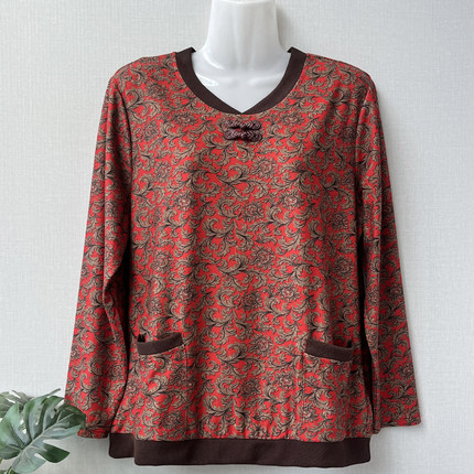 妈妈春装长袖t恤女中老年人新款时尚盘扣宽松花色上衣奶奶装秋衣