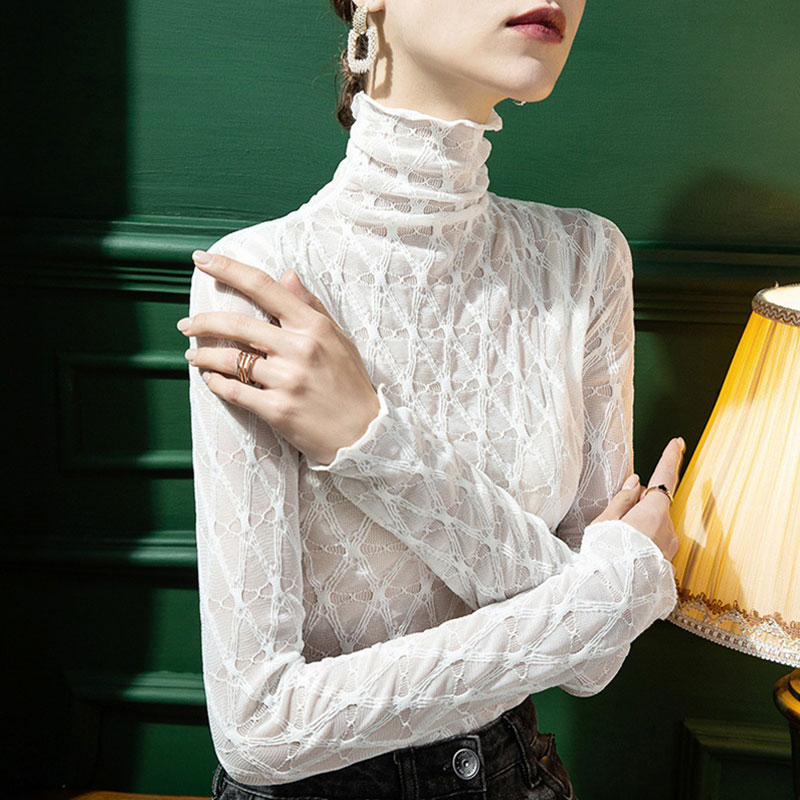 高领蕾丝打底衫女2023秋季新款法式修身内搭洋气加绒长袖网纱上衣