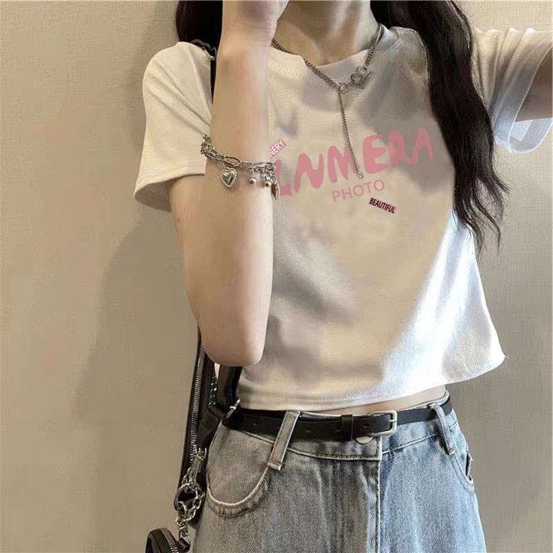 短袖美式高街白色纯棉字母T恤女夏季新款小个子修身正肩短款上衣