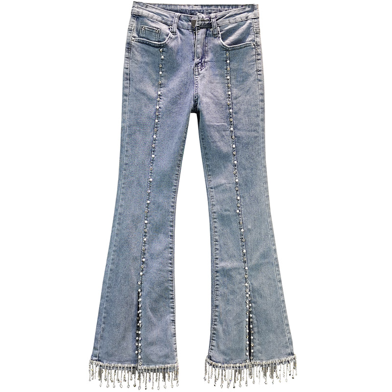 水钻流苏牛仔裤女2025棉弹喇叭裤