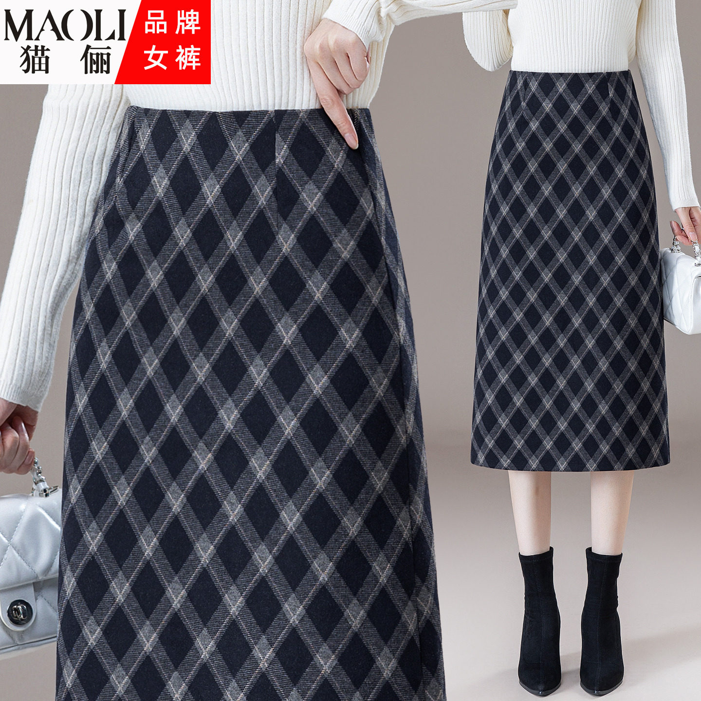 复古格纹毛呢高腰显瘦半身裙女