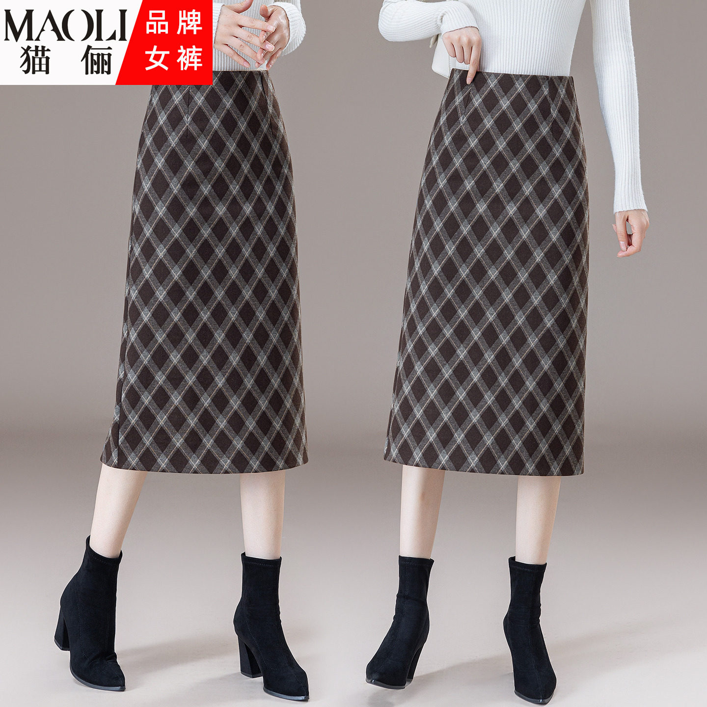 复古格纹毛呢半身裙女2026年秋冬季新款高腰显瘦包臀中长款一步裙