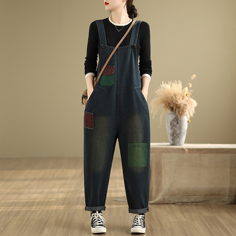 工装牛仔背带裤女春秋大码胖mm洋气贴布遮肉哈伦裤休闲吊带连体裤