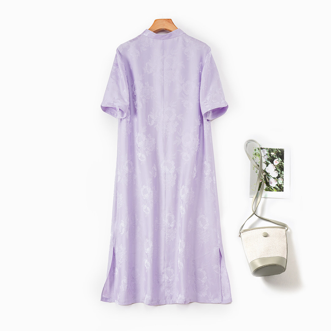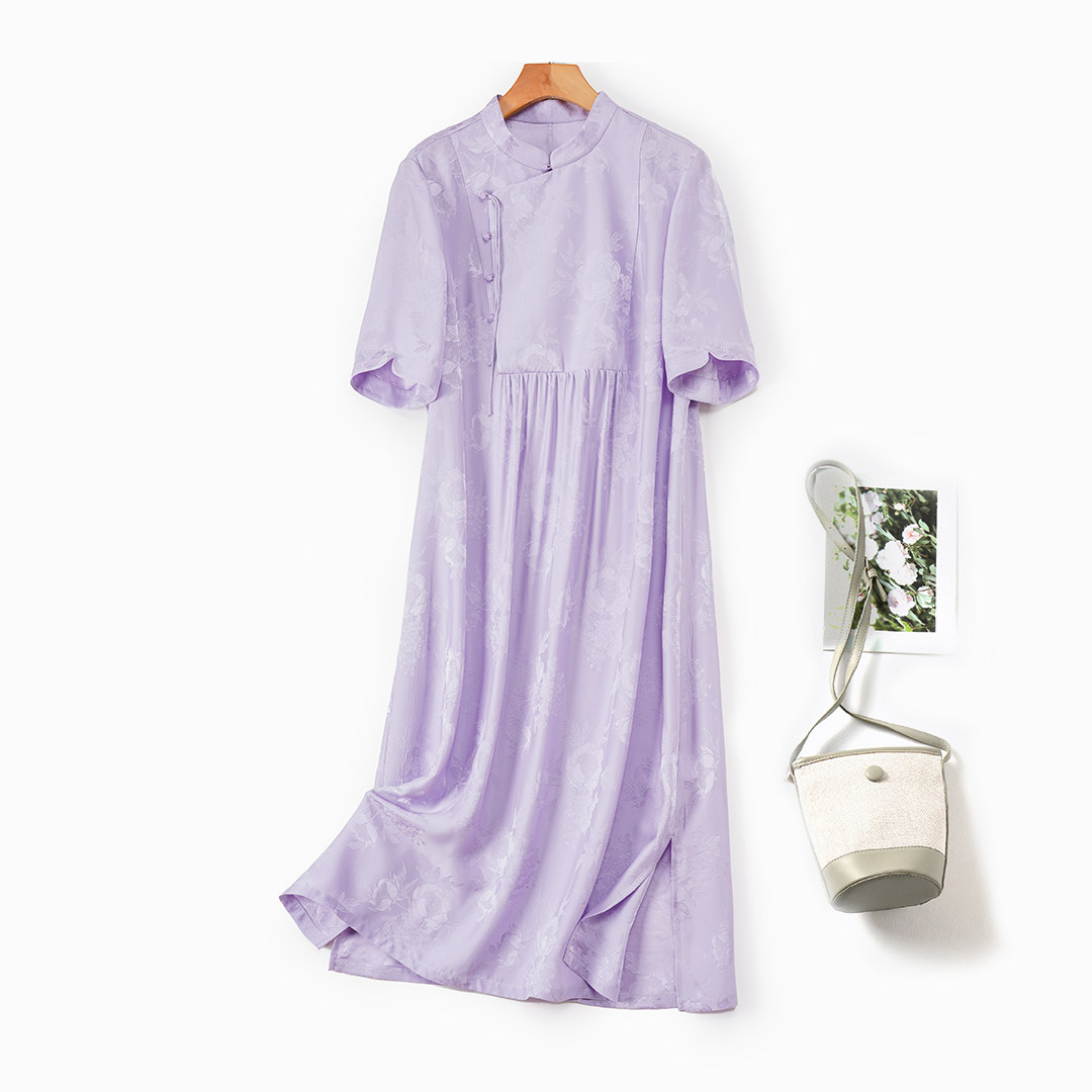【新中式】桑蚕丝51%甜美短袖长裙真丝提花缎国风休闲连衣裙宽松