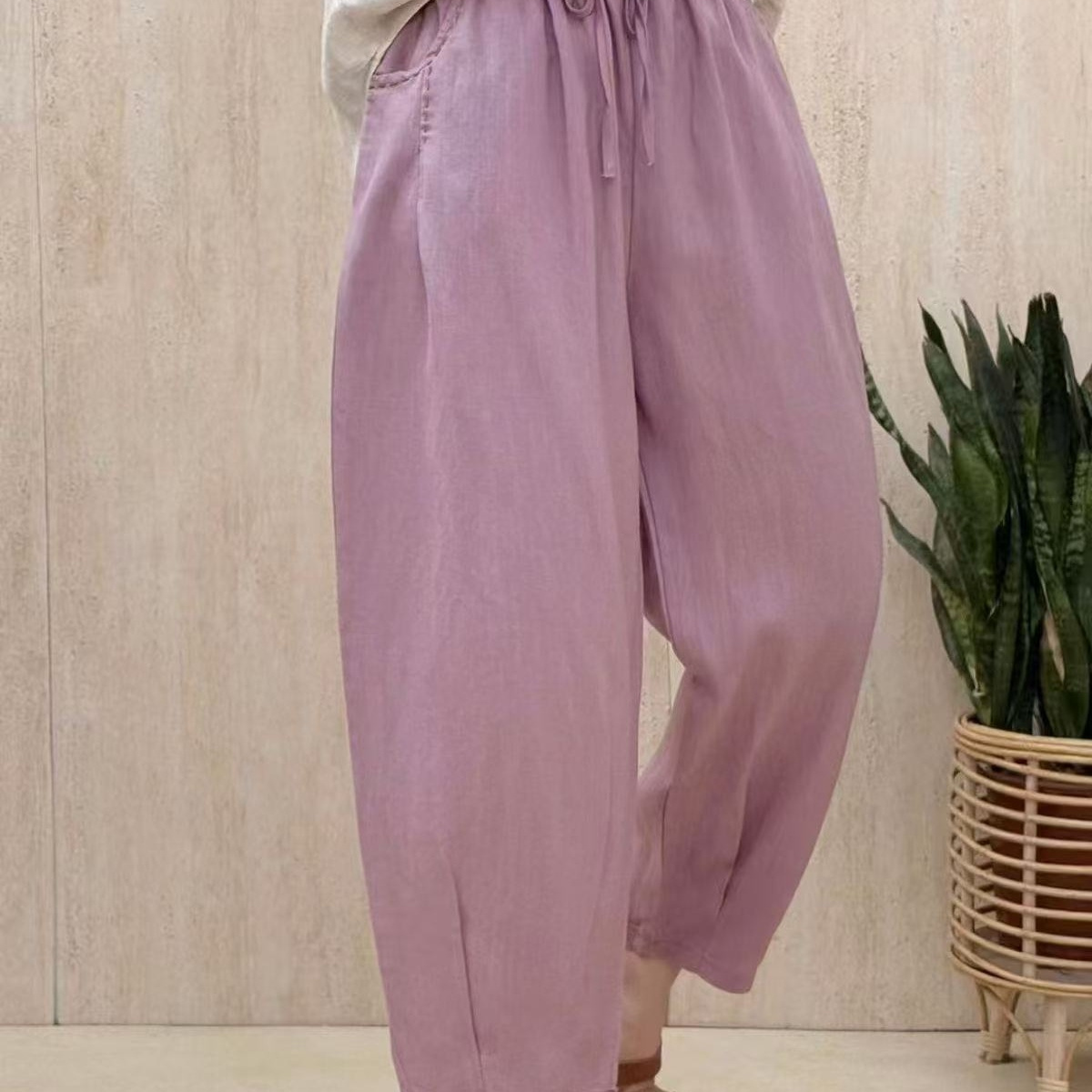 纯色纯亚麻刺绣百搭松紧腰系带休闲裤女夏季新款捏褶哈伦裤潮B44