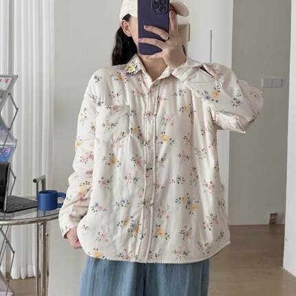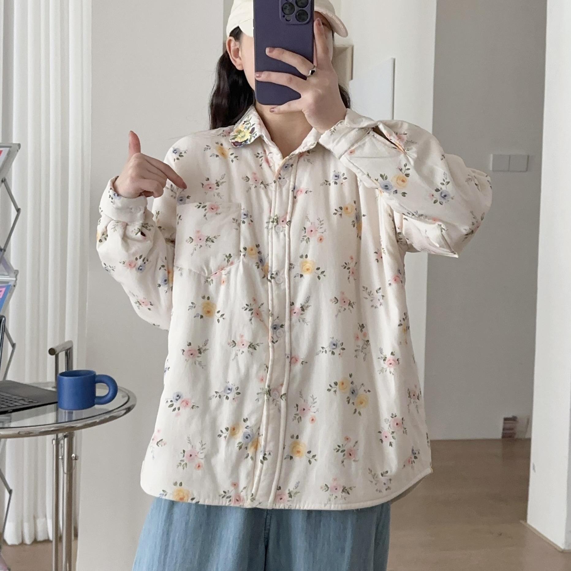 梦箱子2024冬新款花朵印花棉布衬衣刺绣翻领长袖宽松夹棉加厚衬衫
