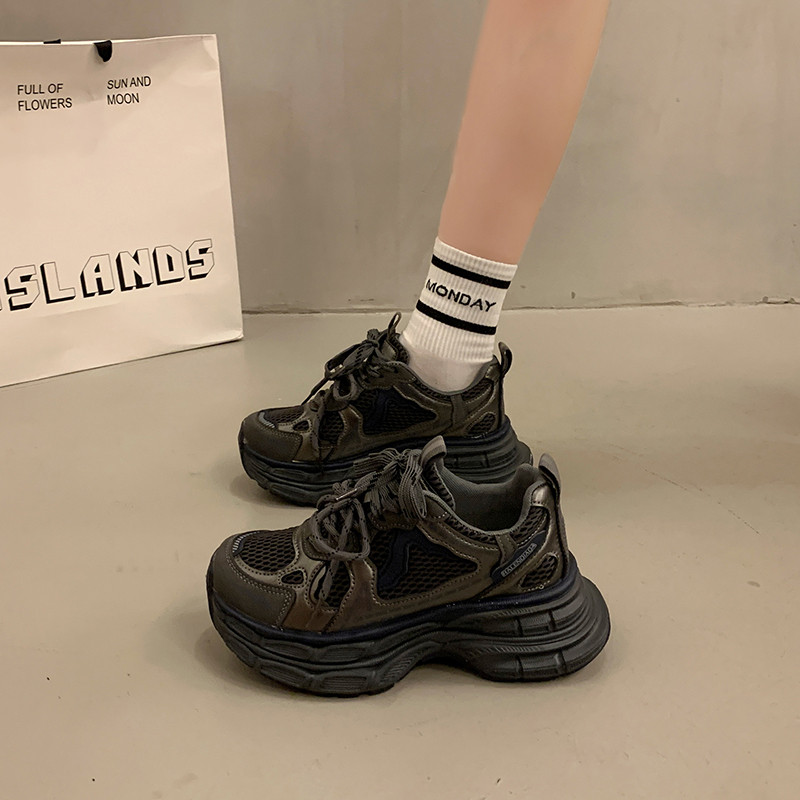 小怪兽厚底百搭潮流运动鞋女2025新款休闲增高系带拼色户外老爹鞋