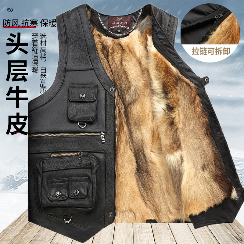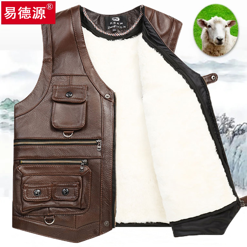 真皮牛皮马甲中老年男秋冬皮毛一体羊毛背心加厚棉坎肩老人爸爸装
