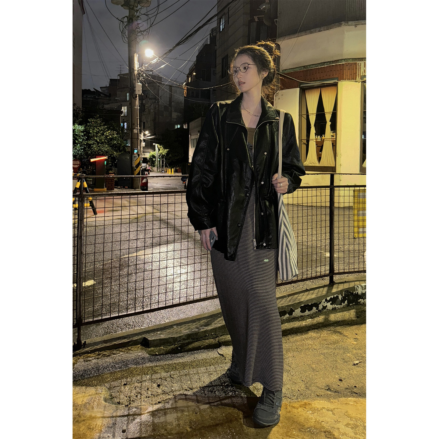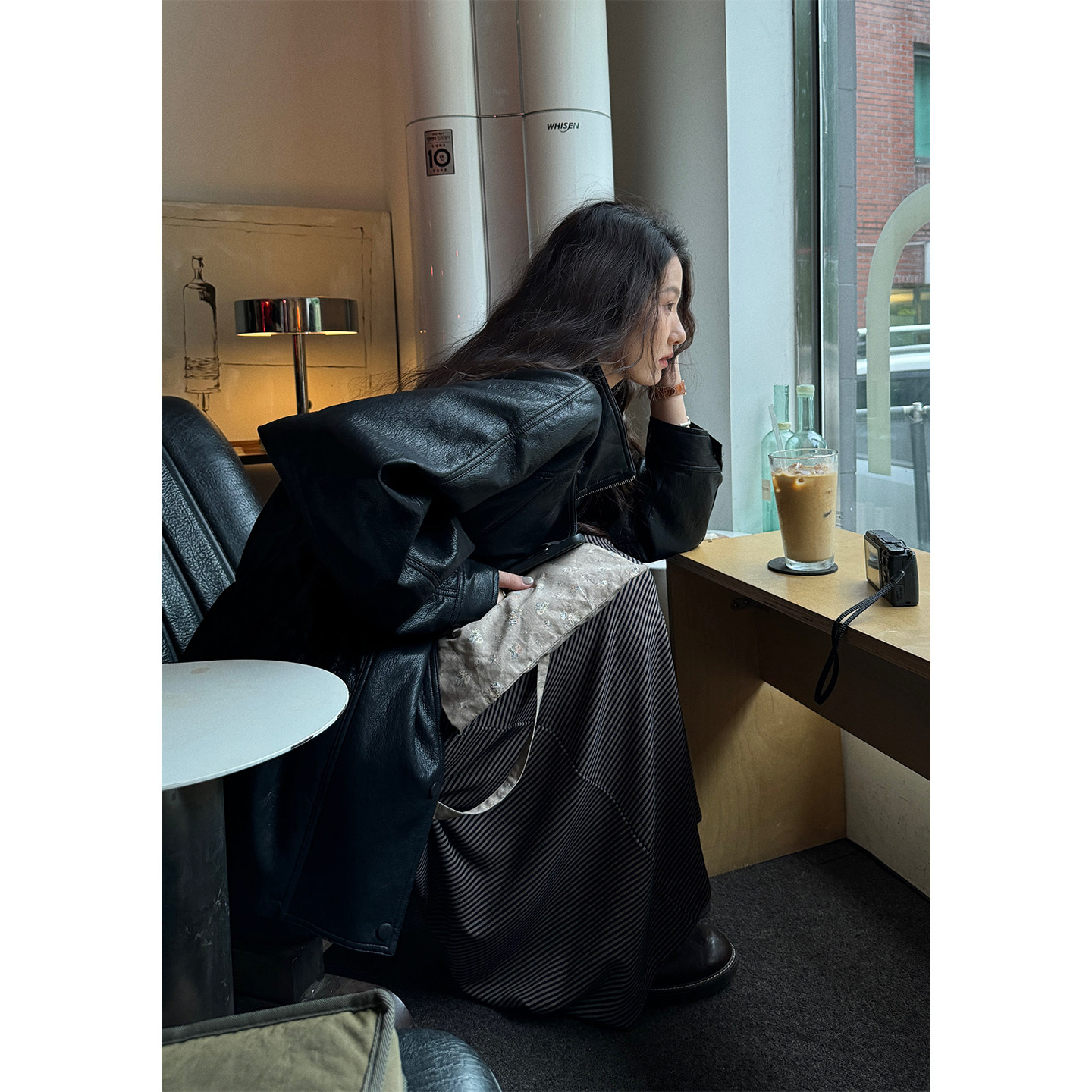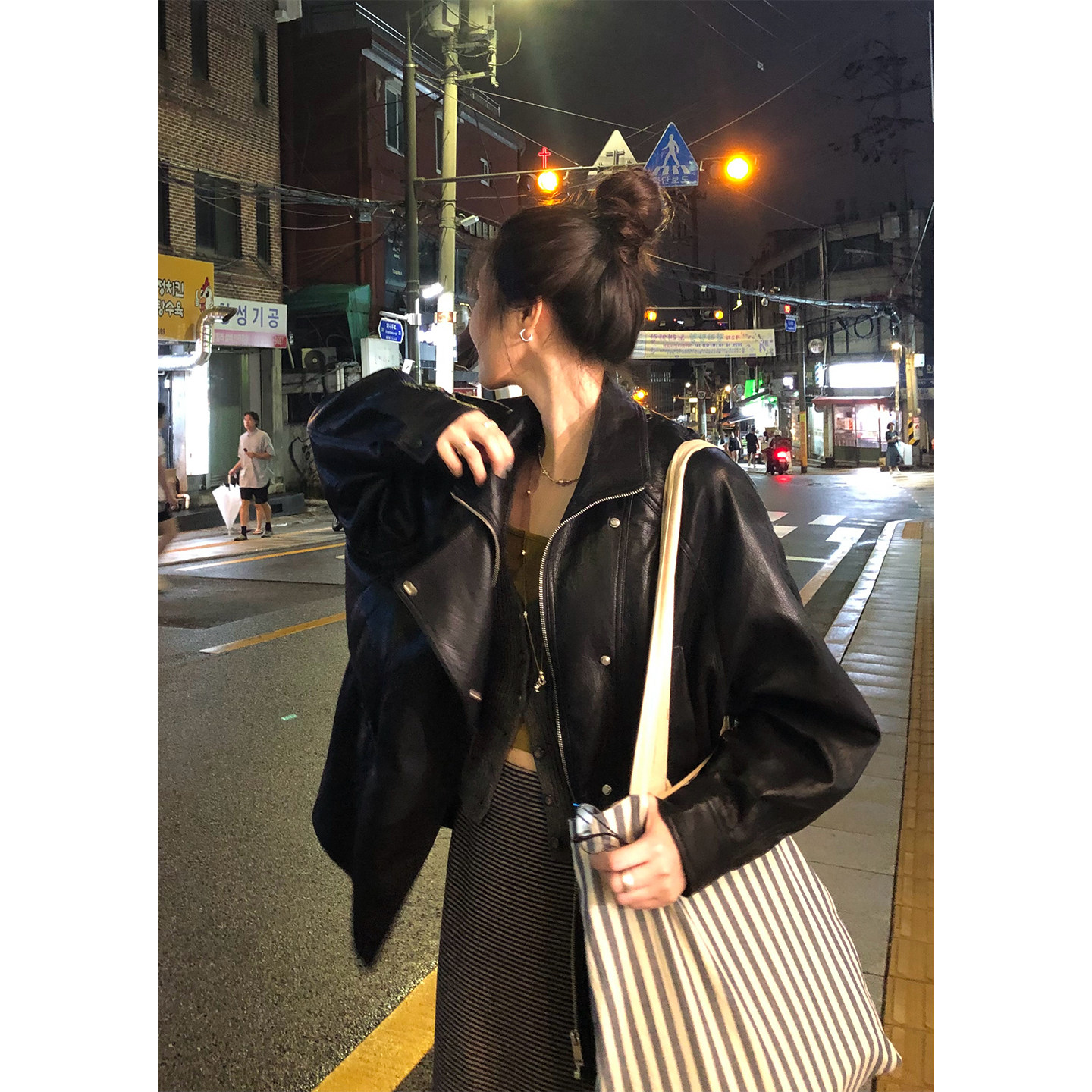 JMWOMEN可抽绳 黑色哑光复古环保PU皮衣女秋季薄款宽松机车风外套