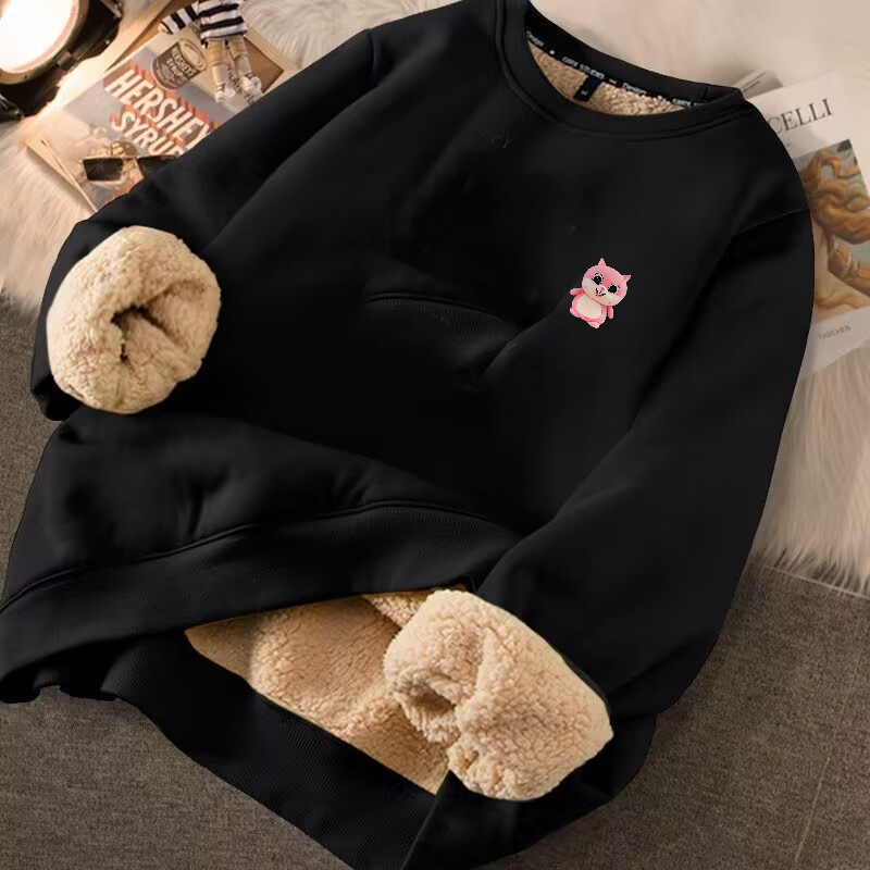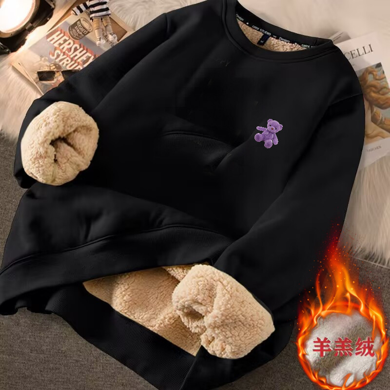 秋冬季女士加大码宽松百搭加绒加厚羊羔绒卫衣圆领套头保暖卫衣女