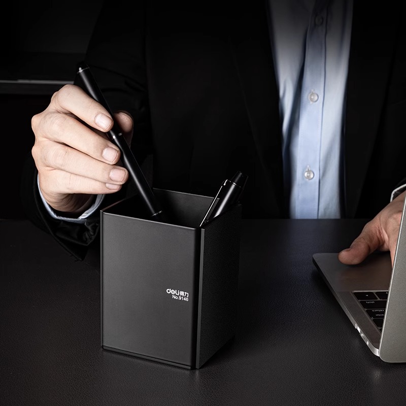 得力金属笔筒CEO经典黑色大号方形笔筒收纳简约办公时尚磨砂质感桌面摆件大气多功能办公室桌面笔筒精致防滑