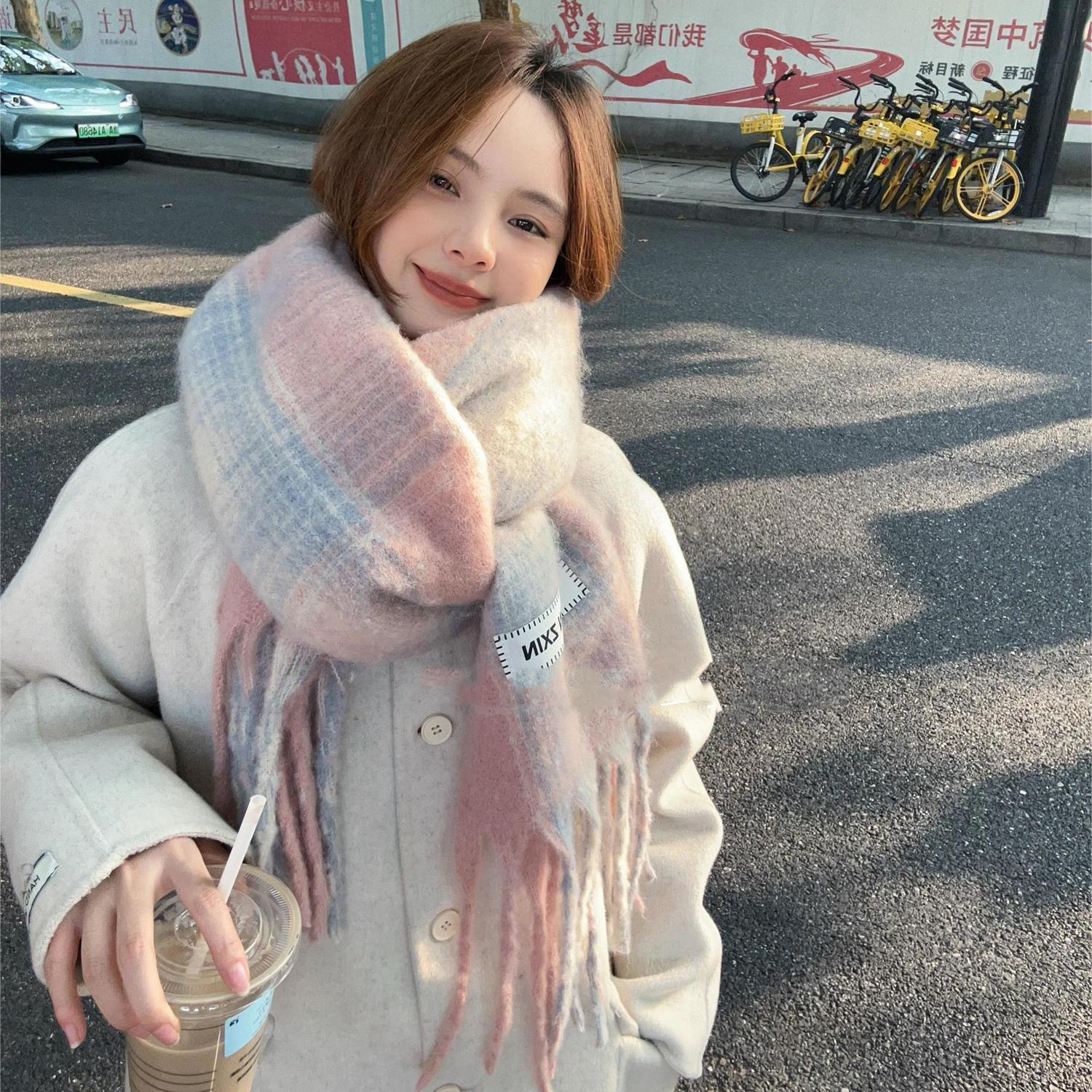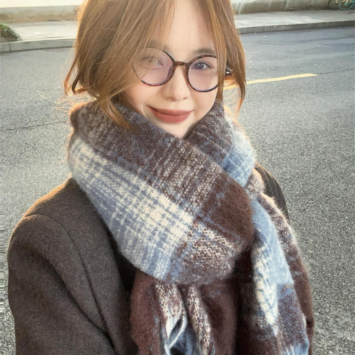 马海毛格子围巾女秋冬季2025新款氛围感ins韩版百搭保暖情侣围脖