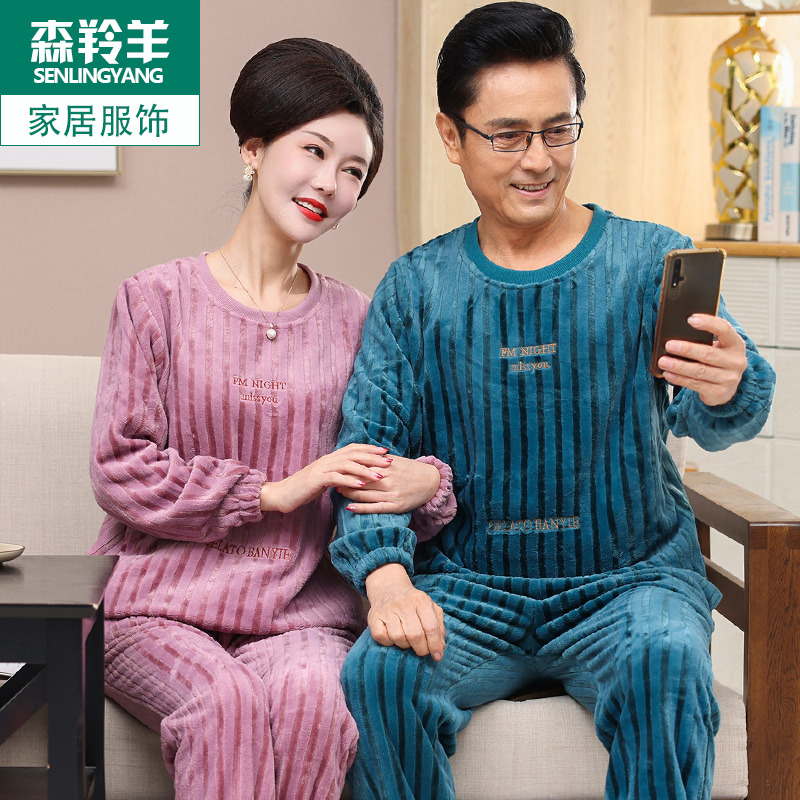 中年爸爸珊瑚绒睡衣女冬季加厚中老年人妈妈法兰绒情侣家居服套装