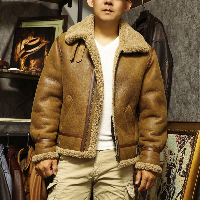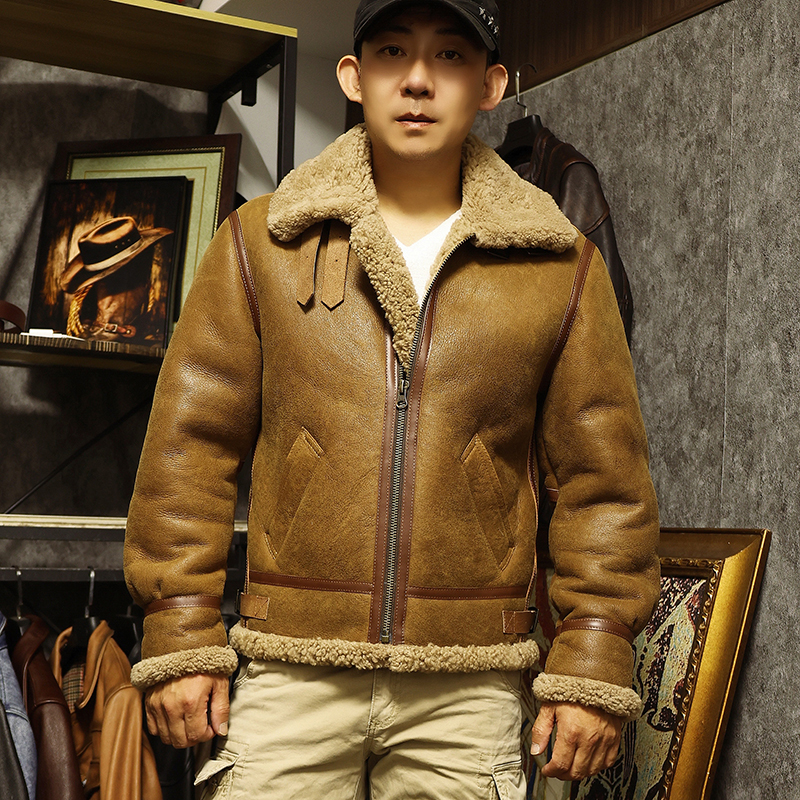B3原生态皮毛一体飞行服男羊羔毛真皮皮衣机车短款夹克皮草外套厚