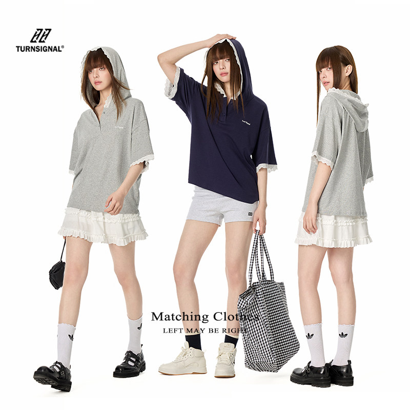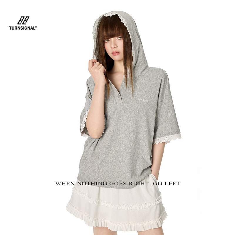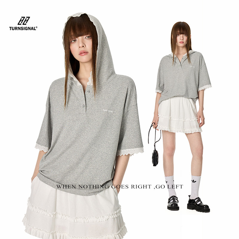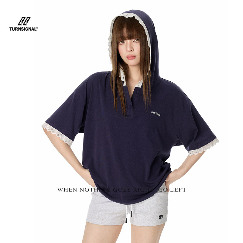 TurnSignal 蕾丝边短袖POLO衫女夏季2026新款休闲宽松V领连帽上衣